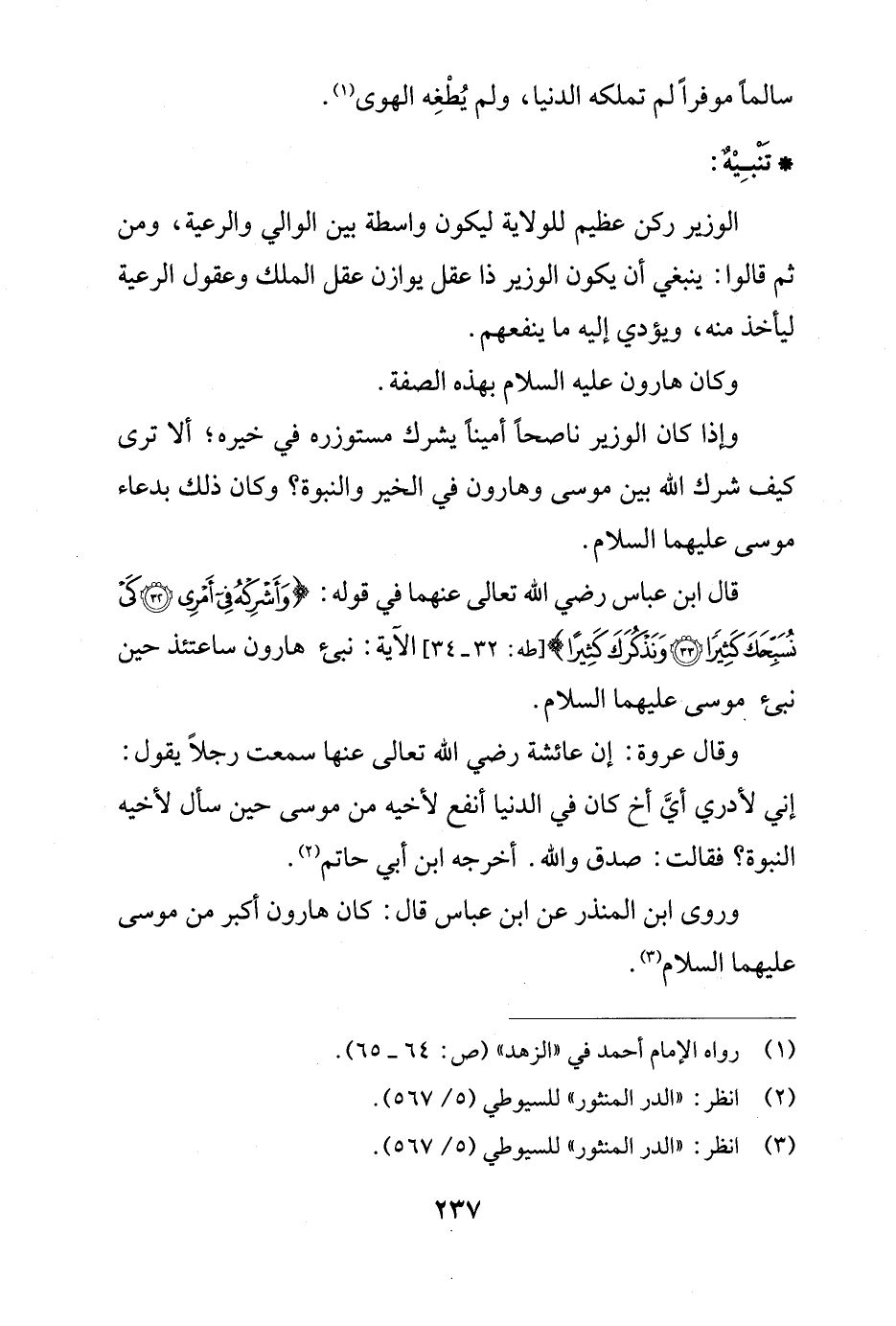 وإذا كان الوزير ناصحاً أمينًا يشرك مستوزره في خيره؛ ألا ترى كيف شرك الله بين موسى وهارون في الخير والنبوة؟ وكان ذلك بدعاء موسى عليهما السلام.
