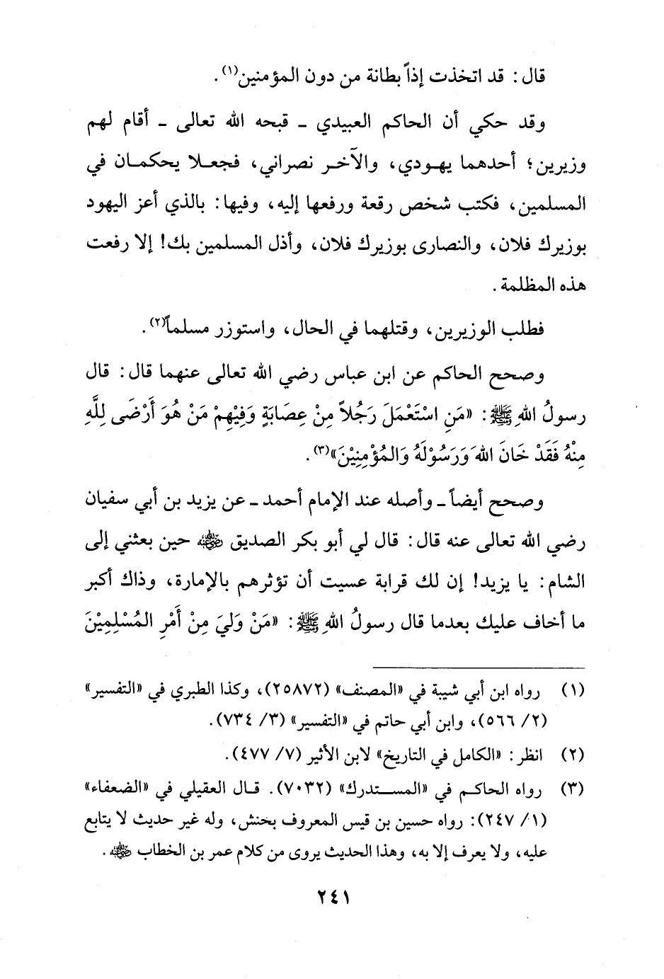 وقد حكي أن الحاكم العبيدي -قبحه الله تعالى- أقام لهم وزيرين؛ أحدهما يهودي، والآخر نصراني، فجعلا يحكمان في المسلمين، فكتب شخص رقعة ورفعها إليه، وفيها: بالذي أعز اليهود بوزيرك فلان، والنصارى بوزيرك فلان، وأذل المسلمين بك! إلا رفعت هذه المظلمة.