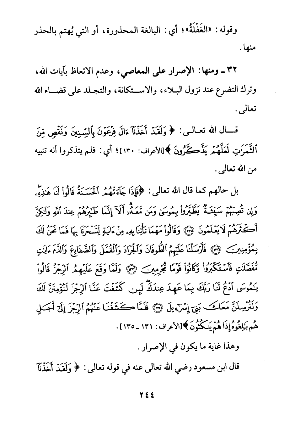 32 - ومنها: الإصرار على المعاصي، وعدم الاتعاظ بآيات الله، وترك التضرع عند نزول النبلاء، والاستكانة، والتجلد على قضاء الله تعالى.