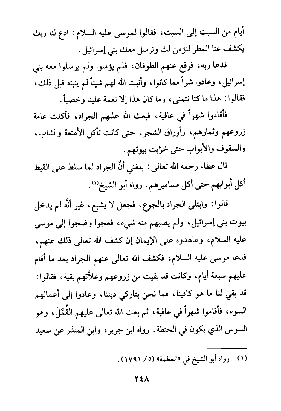قال عطاء رحمه الله تعالى: بلغني أنَّ الجراد لما سلط على القبط أكل أبوابهم حتى أكل مساميرهم. رواه أبو الشيخ (¬1).