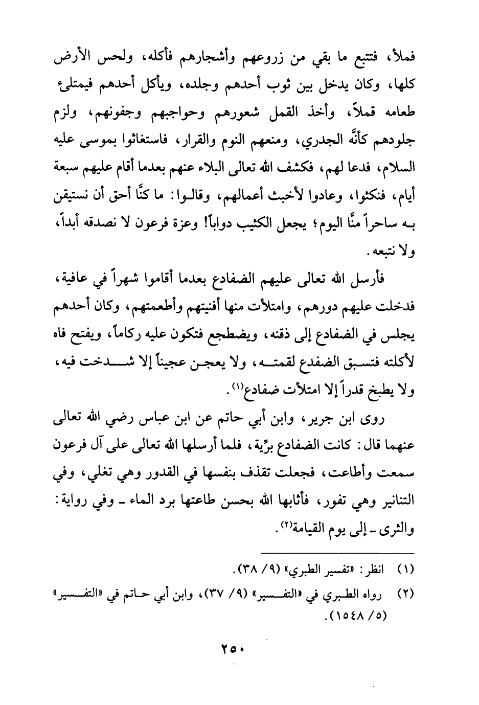 فملأ، فتتبع ما بقي من زروعهم وأشجارهم فأكله، ولحس الأرض كلها، وكان يدخل بين ثوب أحدهم وجلده، ويأكل أحدهم فيمتلئ طعامه قملاً، وأخذ القمل شعورهم وحواجبهم وجفونهم، ولزم جلودهم كأنَّه الجدري، ومنعهم النوم والقرار، فاستغاثوا بموسى عليه السلام، فدعا لهم، فكشف الله تعالى البلاء عنهم بعد ما أقام عليهم سبعة أيام، فنكثوا، وعادوا لأخبث أعمالهم، وقالوا: ما كنَّا أحق أن نستيقن به ساحراً منَّا اليوم؛ يجعل الكثيب دوابًا! وعزة فرعون لا نصدقه أبدًا، ولا نتبعه.