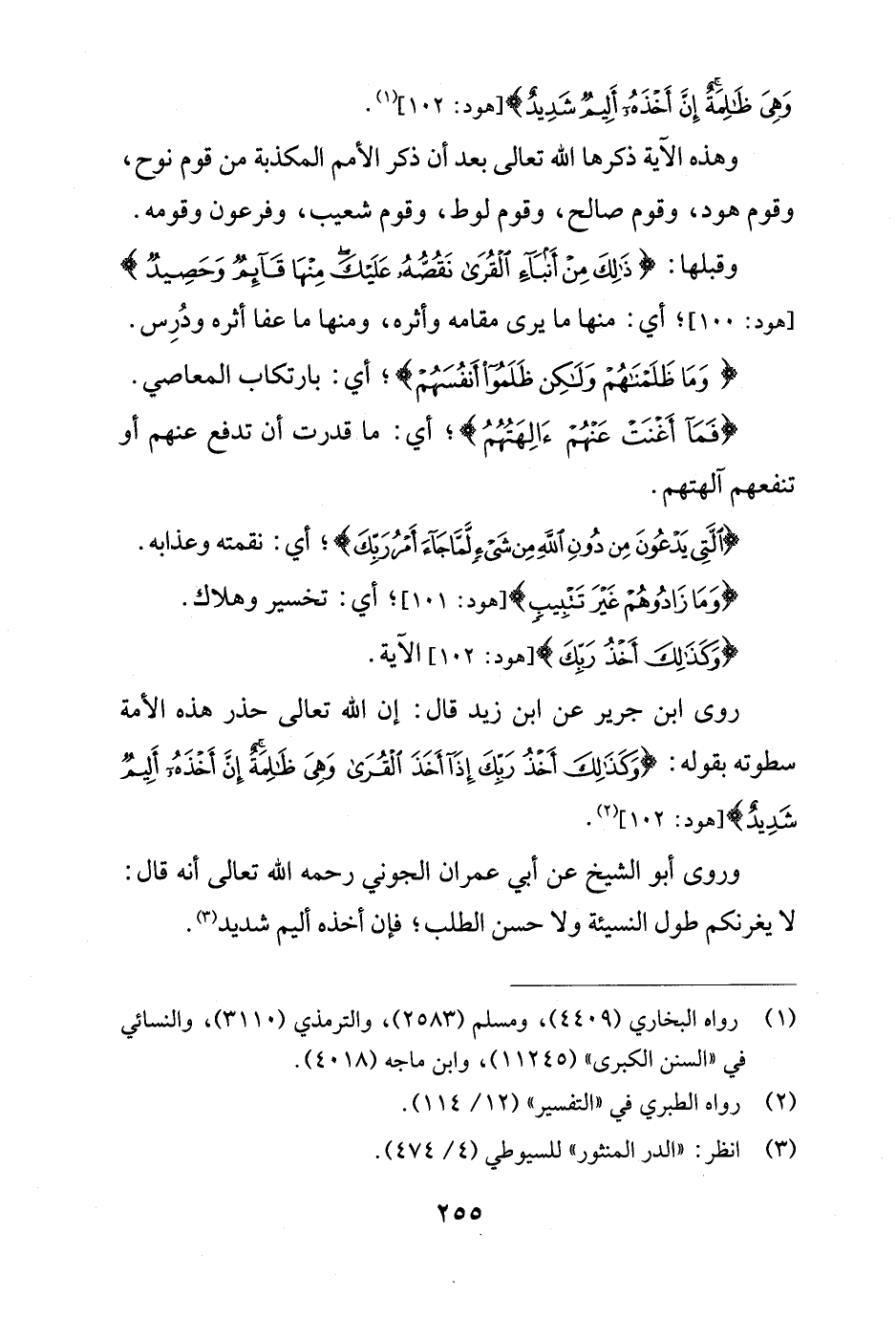 روى ابن جرير عن ابن زيد قال: إن الله تعالى حذر هذه الأمة سطوته بقوله: {وَكَذَلِكَ أَخْذُ رَبِّكَ إِذَا أَخَذَ الْقُرَى وَهِيَ ظَالِمَةٌ إِنَّ أَخْذَهُ أَلِيمٌ شَدِيدٌ} [هود: 102] (¬2).