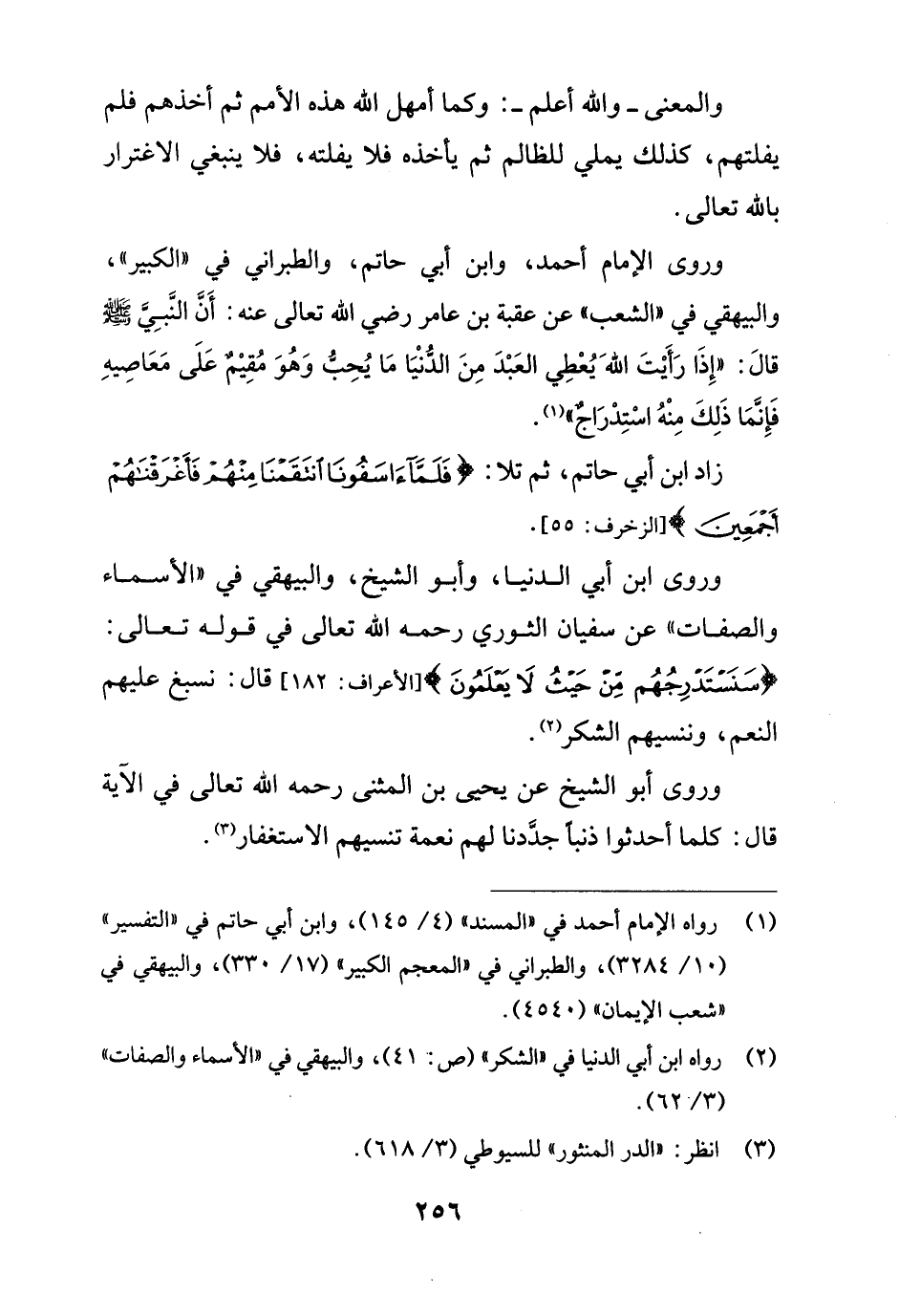 وروى ابن أبي الدنيا، وأبو الشيخ، والبيهقي في "الأسماء والصفات" عن سفيان الثوري رحمه الله تعالى في قوله تعالى: {سَنَسْتَدْرِجُهُمْ مِنْ حَيْثُ لَا يَعْلَمُونَ} [الأعراف: 182] قال: نسبغ عليهم النعم، وننسيهم الشكر (¬2).
