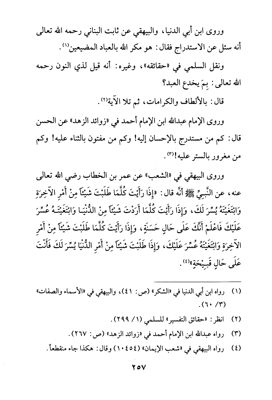 وروى الإِمام عبد الله ابن الإِمام أحمد في "زوائد الزهد" عن الحسن قال: كم من مستدرج بالإحسان إليه! وكم من مفتون بالثناء عليه! وكم من مغرور بالستر عليه! (¬3).