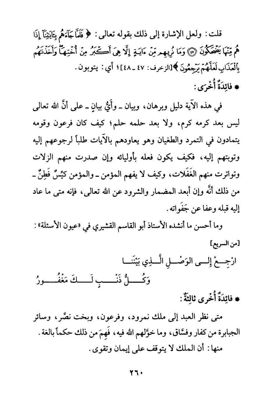 في هذه الآية دليل وبرهان، وبيان -وأَيُّ بيانٍ- على أن الله تعالى ليس بعد كرمه كرم، ولا بعد حلمه حلم؛ كيف كان فرعون وقومه يتمادون في التمرد والطغيان وهو يعاودهم بالآيات طلبًا لرجوعهم إليه وتوبتهم إليه، فكيف يكون فعله بأوليائه وإن صدرت منهم الزلات وتواترت منهم الغَفَلات، وكيف لا يفهم المؤمن -والمؤمن كيِّسٌ فَطِنٌ- من ذلك أنَّه وإن أبعد المضمار والشرود عن الله تعالى، فإنه متى ما عاد إليه قبله وعفا عن جَفَواته.