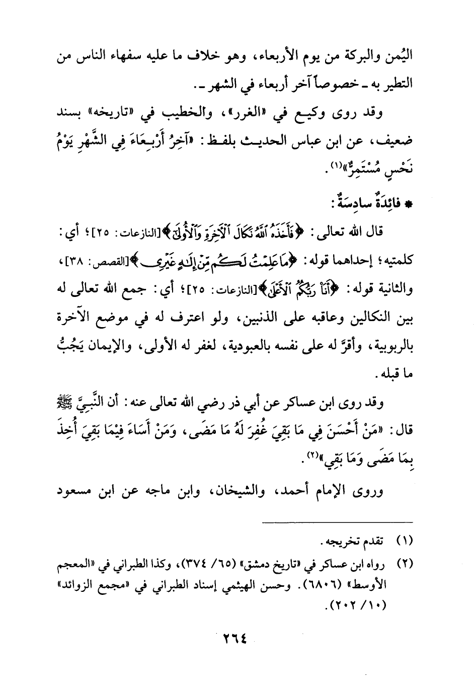 وقد روى وكيع في "الغرر"، والخطيب في "تاريخه" بسند ضعيف، عن ابن عباس الحديث بلفظ: "آخِرُ أَرْبِعَاءَ في الشَّهْرِ يَوْمُ نَحْسٍ مُسْتَمِرٌّ" (¬1).