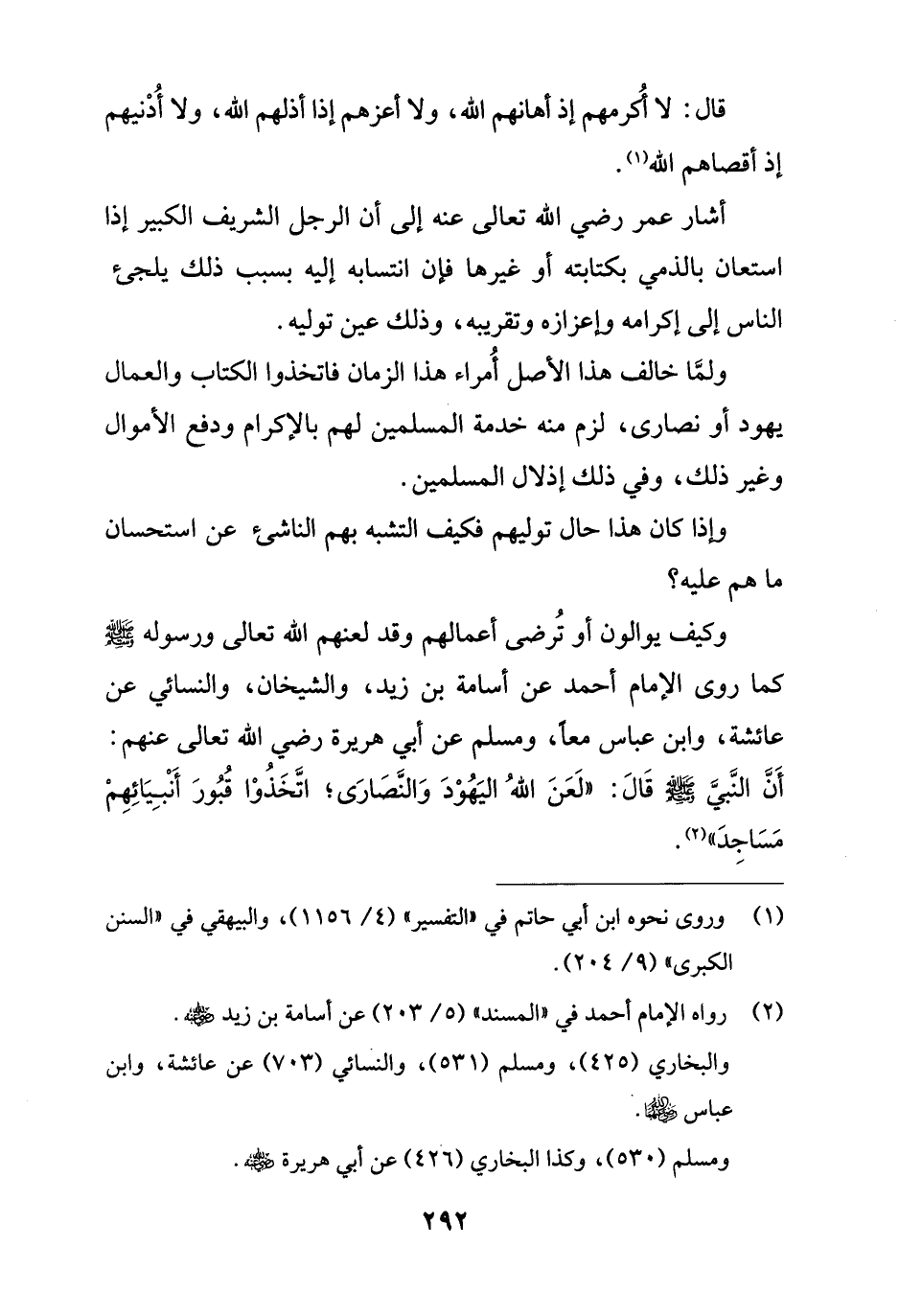 ولمَّا خالف هذا الأصل أُمراء هذا الزمان فاتخذوا الكتاب والعمال يهود أو نصارى، لزم منه خدمة المسلمين لهم بالإكرام ودفع الأموال وغير ذلك، وفي ذلك إذلال المسلمين.