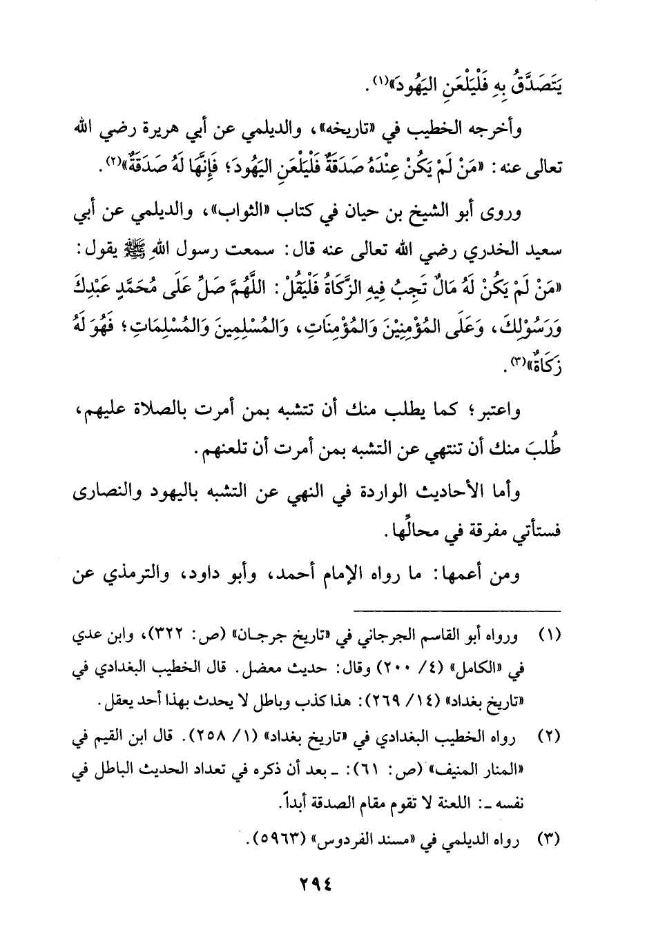 وأخرجه الخطيب في "تاريخه"، والديلمي عن أبي هريرة رضي الله تعالى عنه: "مَنْ لَمْ يَكُنْ عِنْدَهُ صَدَقَةٌ فَلْيَلْعَنِ اليَهُودَ؛ فَإِنَّهَا لَهُ صَدَقَةٌ" (¬2).