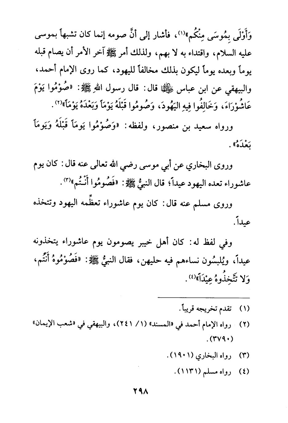 وفي لفظ له: كان أهل خيبر يصومون يوم عاشوراء يتخذونه عيداً، ويُلبسُون نساءهم فيه حليهن، فقال النبيُّ -صلى الله عليه وسلم-: "فَصُوْمُوهُ أَنْتُم، وَلا تتَّخِذُوهُ عِيْدًا" (¬4).