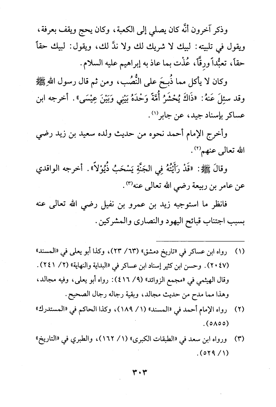 وكان لا يأكل مما ذُبحَ على النُّصُب، ومن ثم قال رسول اللهِ -صلى الله عليه وسلم- وقد سئِلَ عَنهُ: "ذَاكَ يُحْشَرُ أُمَّةً وَحْدَهُ بَيْنِي وَبَيْنَ عِيْسَى". أخرجه ابن عساكر بإسناد جيد، عن جابر (¬1).