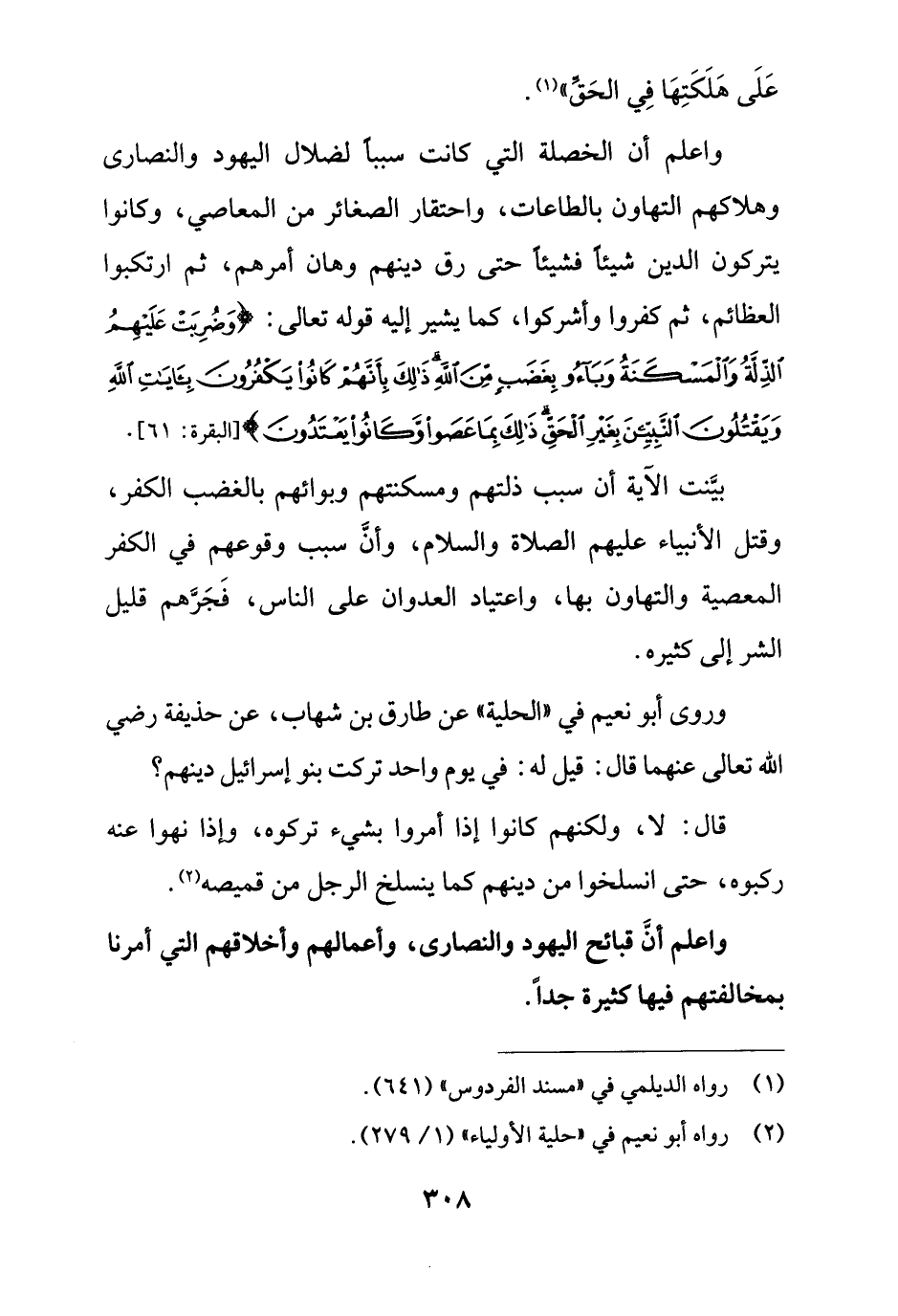 واعلم أن الخصلة التي كانت سبباً لضلال اليهود والنصارى وهلاكهم التهاون بالطاعات، واحتقار الصغائر من المعاصي، وكانوا يتركون الدين شيئاً فشيئاً حتى رق دينهم وهان أمرهم، ثم ارتكبوا العظائم، ثم كفروا وأشركوا، كما يشير إليه قوله تعالى: {وَضُرِبَتْ عَلَيْهِمُ الذِّلَّةُ وَالْمَسْكَنَةُ وَبَاءُوا بِغَضَبٍ مِنَ اللَّهِ ذَلِكَ بِأَنَّهُمْ كَانُوا يَكْفُرُونَ بِآيَاتِ اللَّهِ وَيَقْتُلُونَ النَّبِيِّينَ بِغَيْرِ الْحَقِّ ذَلِكَ بِمَا عَصَوْا وَكَانُوا يَعْتَدُونَ} [البقرة: 61].