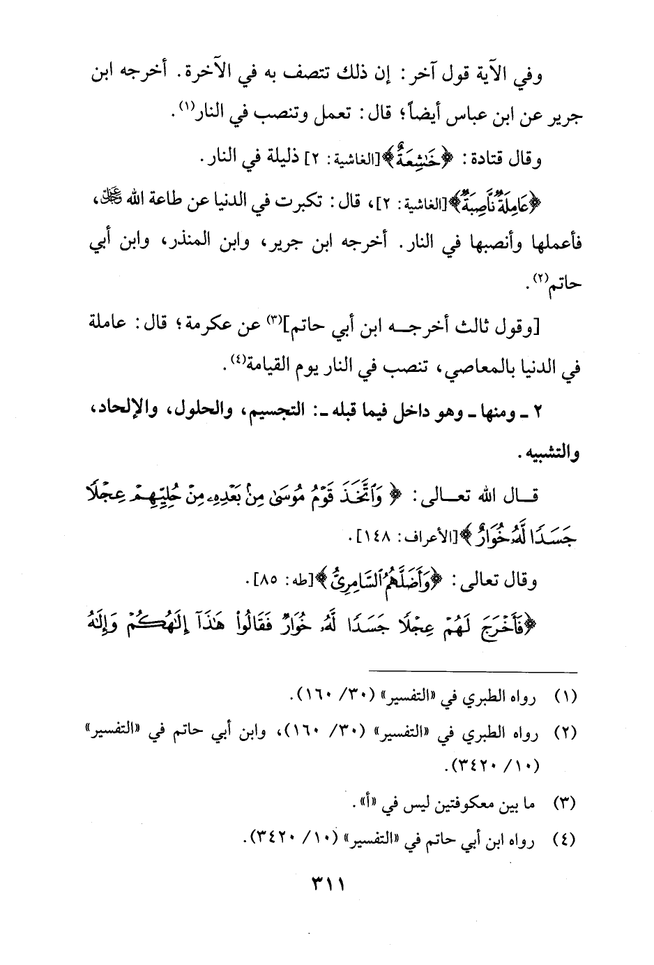 {عَامِلَةٌ نَاصِبَةٌ} [الغاشية: 2]، قال: تكبرت في الدنيا عن طاعة الله عز وجل، فأعملها وأنصبها في النار. أخرجه ابن جرير، وابن المنذر، وابن أبي حاتم (¬2).
