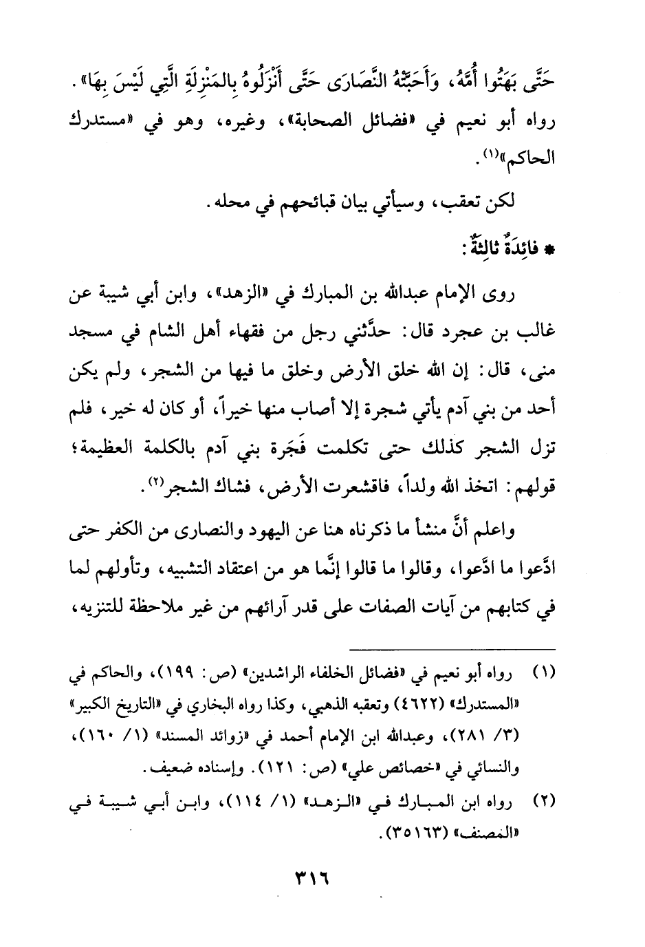 روى الإمام عبد الله بن المبارك في "الزهد"، وابن أبي شيبة عن غالب بن عجرد قال: حدَّثني رجل من فقهاء أهل الشام في مسجد منى، قال: إن الله خلق الأرض وخلق ما فيها من الشجر، ولم يكن أحد من بني آدم يأتي شجرة إلا أصاب منها خيراً، أو كان له خير، فلم تزل الشجر كذلك حتى تكلمت فَجَرة بني آدم بالكلمة العظيمة؛ قولهم: اتخذ الله ولداً، فاقشعرت الأرض، فشاك الشجر (¬2).