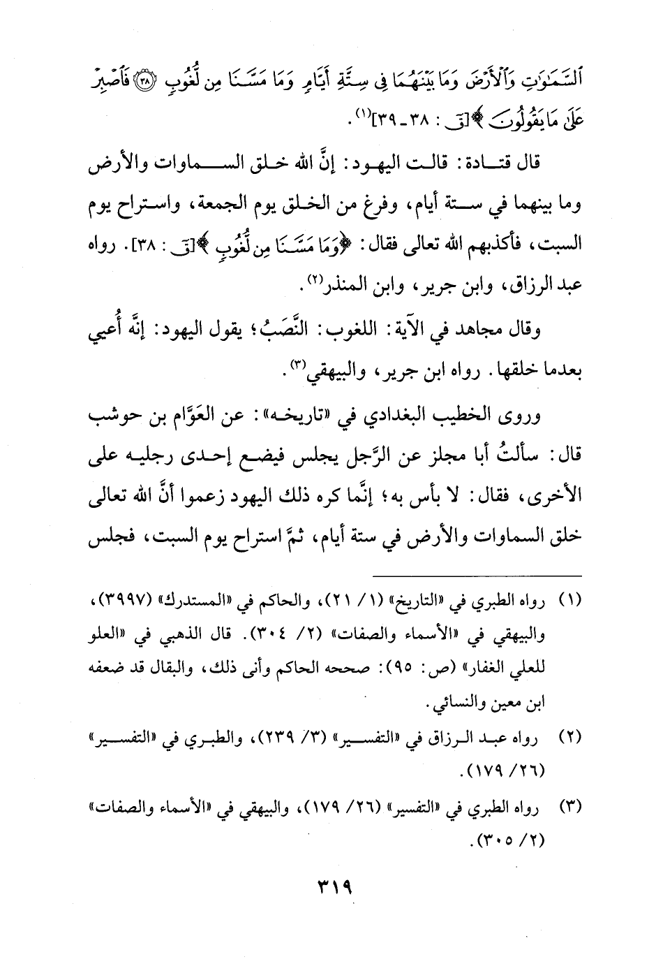 وقال مجاهد في الآية: اللغوب: النَّصَبُ؛ يقول اليهود: إنَّه أُعيي بعدما خلقها. رواه ابن جرير، والبيهقي (¬3).