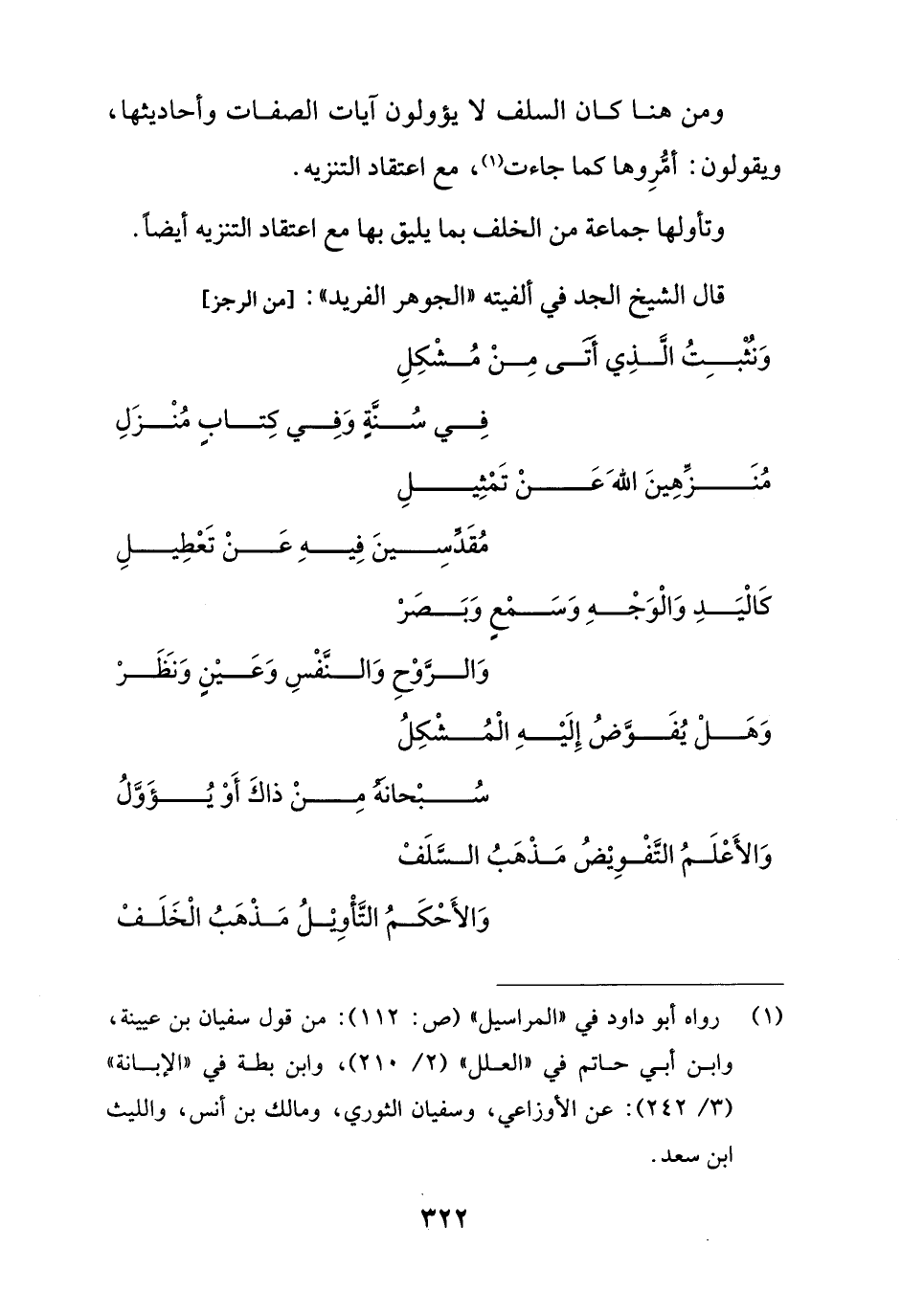 وَالأَعْلَمُ التَّفْوِيْضُ مَذْهَبُ السَّلَفْ ... وَالأَحْكَمُ التَّأْوِيْلُ مَذْهَبُ الْخَلَفْ