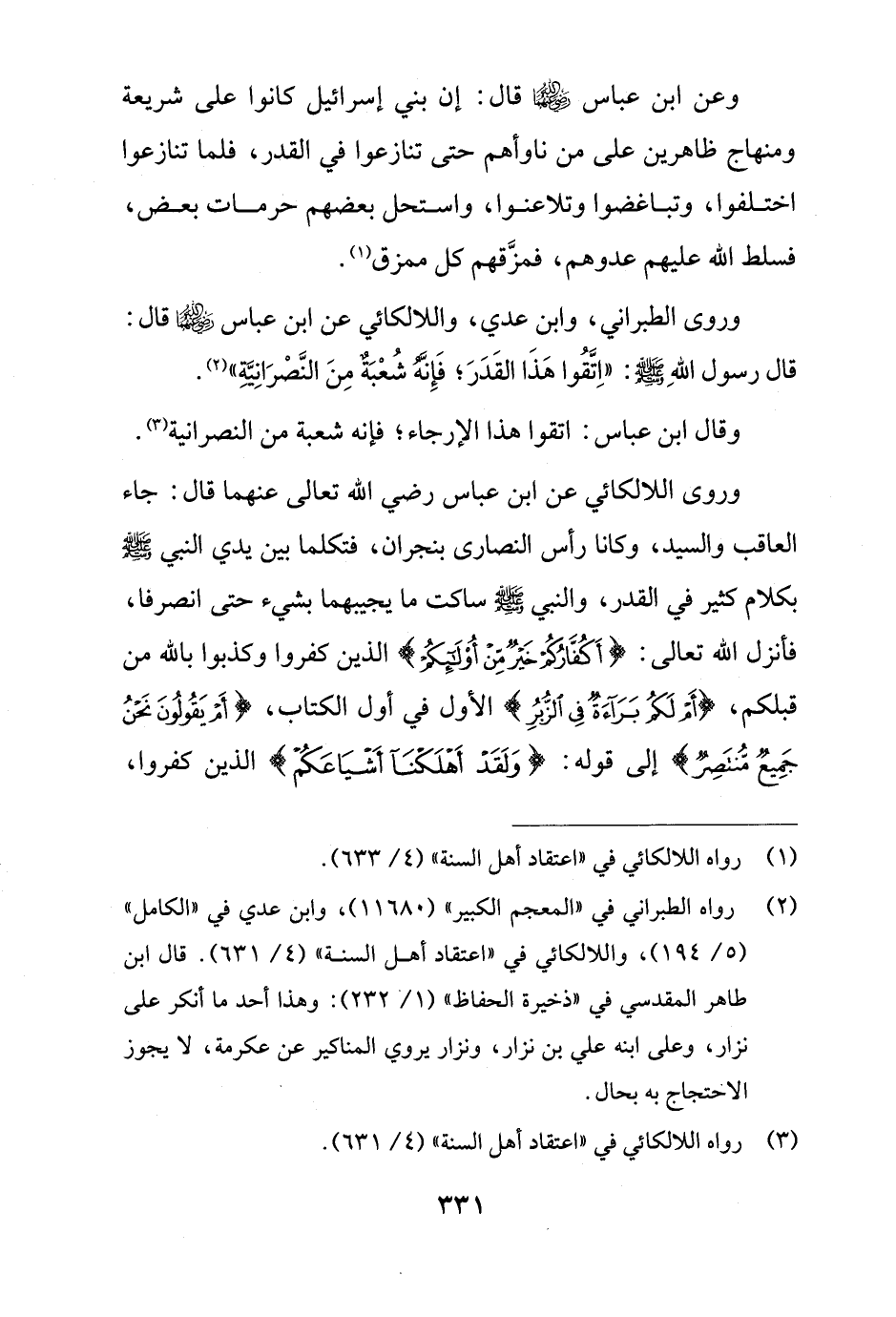 وروى الطبراني، وابن عدي، واللالكائي عن ابن عباس -رضي الله عنهما- قال: قال رسول اللهِ -صلى الله عليه وسلم-: "اِتَّقُوا هَذَا القَدَرَ؛ فَإِنَّهُ شُعْبَةٌ مِنَ النَّصْرَانِية" (¬2).