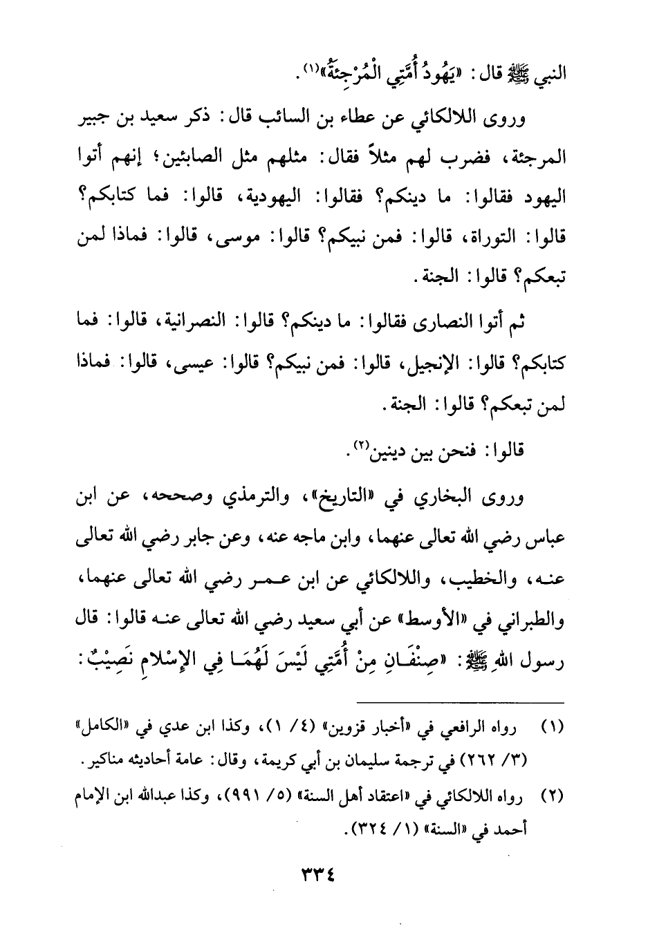 وروى اللالكائي عن عطاء بن السائب قال: ذكر سعيد بن جبير المرجئة، فضرب لهم مثلاً فقال: مثلهم مثل الصابئين؛ إنهم أتوا اليهود فقالوا: ما دينكم؟ فقالوا: اليهودية، قالوا: فما كتابكم؟ قالوا: التوراة، قالوا: فمن نبيكم؟ قالوا: موسى، قالوا: فماذا لمن تبعكم؟ قالوا: الجنة.