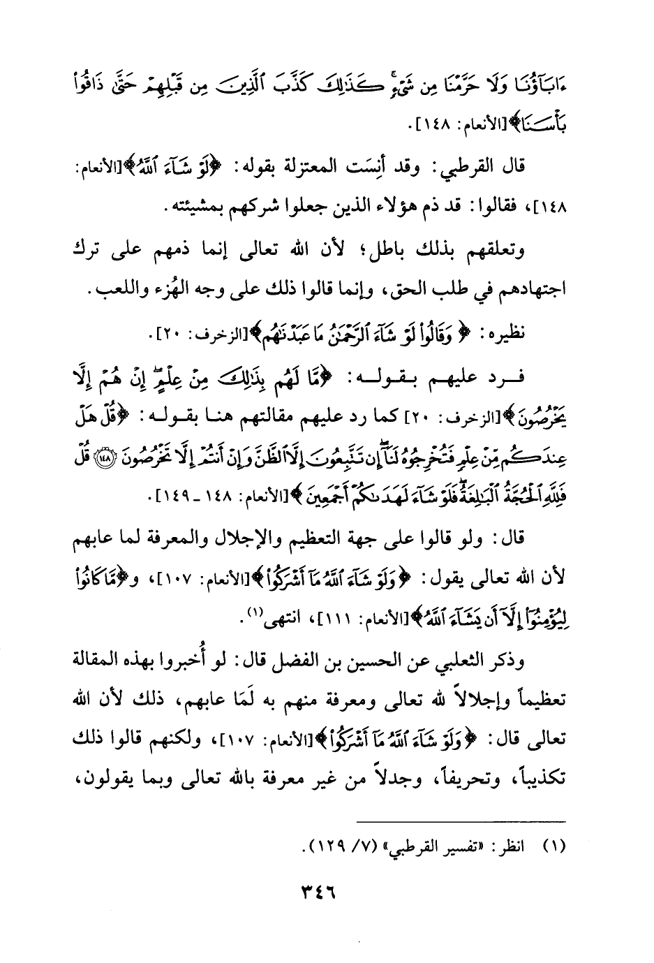 قال القرطبي: وقد أنِسَت المعتزلة بقوله: {لَوْ شَاءَ اللَّهُ} [الأنعام: 148]، فقالوا: قد ذم هؤلاء الذين جعلوا شركهم بمشيئته.
