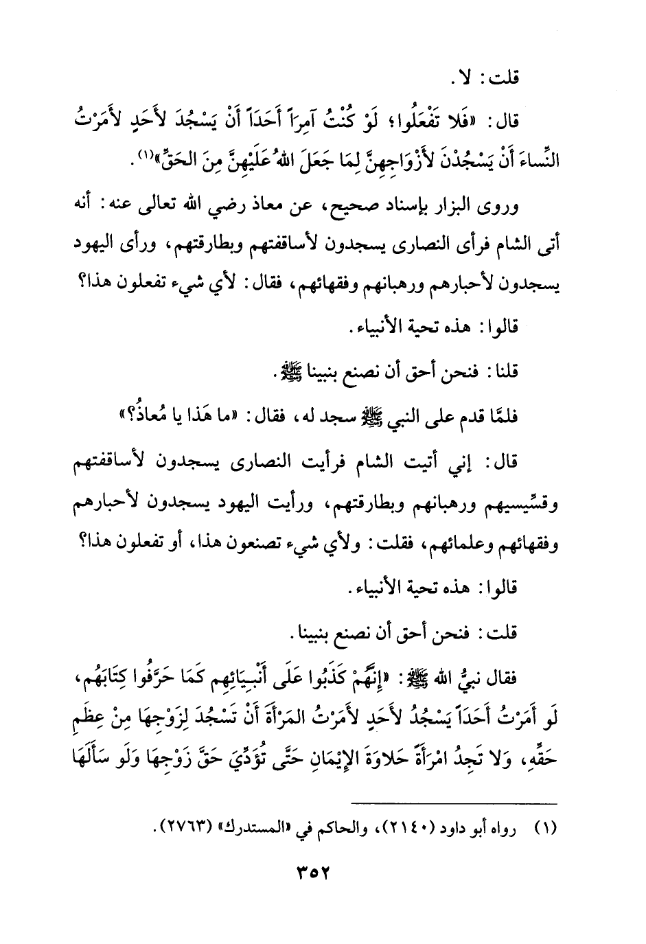 وروى البزار بإسناد صحيح، عن معاذ رضي الله تعالى عنه: أنه أتى الشام فرأى النصارى يسجدون لأساقفتهم وبطارقتهم، ورأى اليهود يسجدون لأحبارهم ورهبانهم وفقهائهم، فقال: لأي شيء تفعلون هذا؟