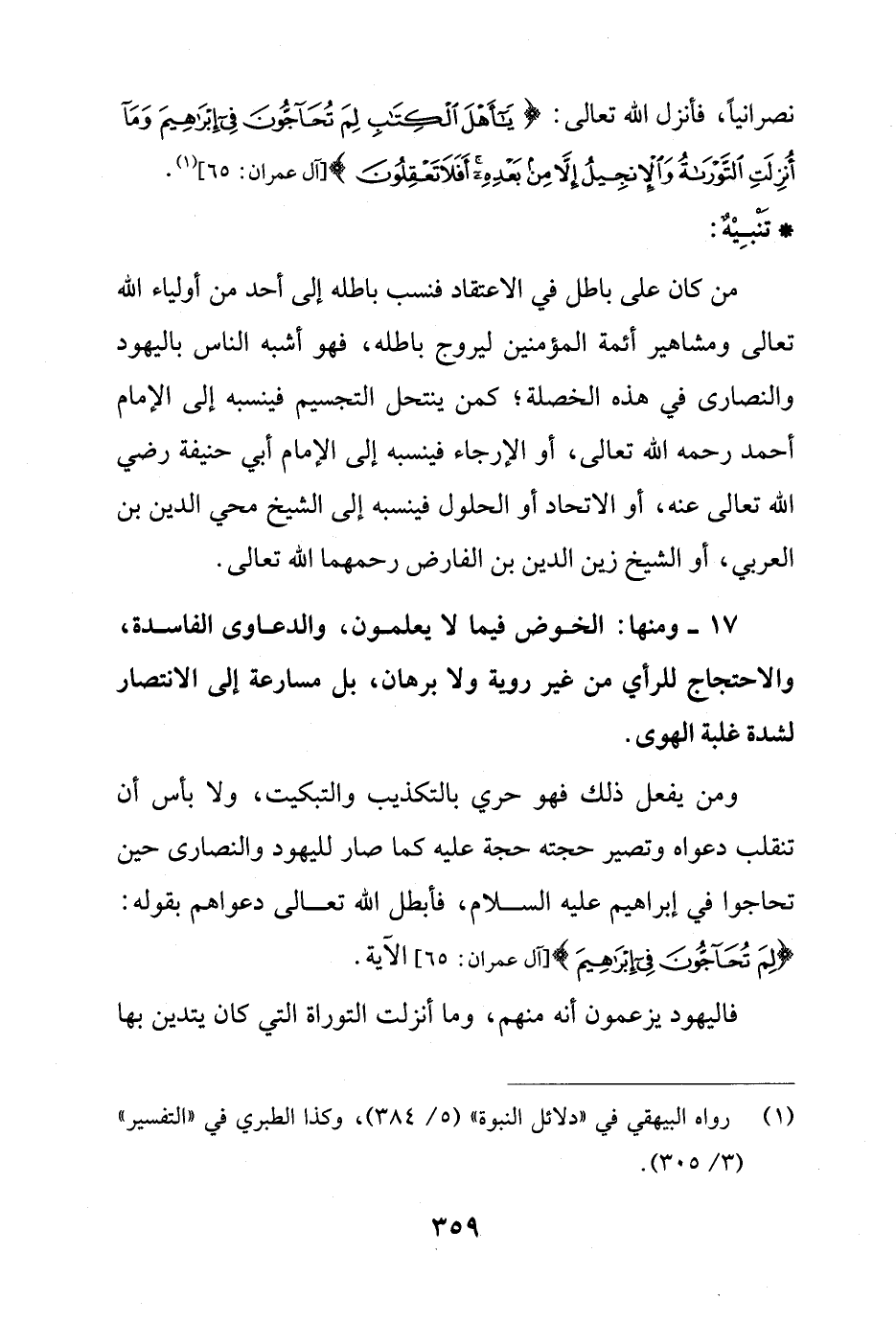 من كان على باطل في الاعتقاد فنسب باطله إلى أحد من أولياء الله تعالى ومشاهير أئمة المؤمنين ليروج باطله، فهو أشبه الناس باليهود والنصارى في هذه الخصلة؛ كمن ينتحل التجسيم فينسبه إلى الإمام أحمد رحمه الله تعالى، أو الإرجاء فينسبه إلى الإمام أبي حنيفة رضي الله تعالى عنه، أو الاتحاد أو الحلول فينسبه إلى الشيخ محي الدين بن العربي، أو الشيخ زين الدين بن الفارض رحمهما الله تعالى.