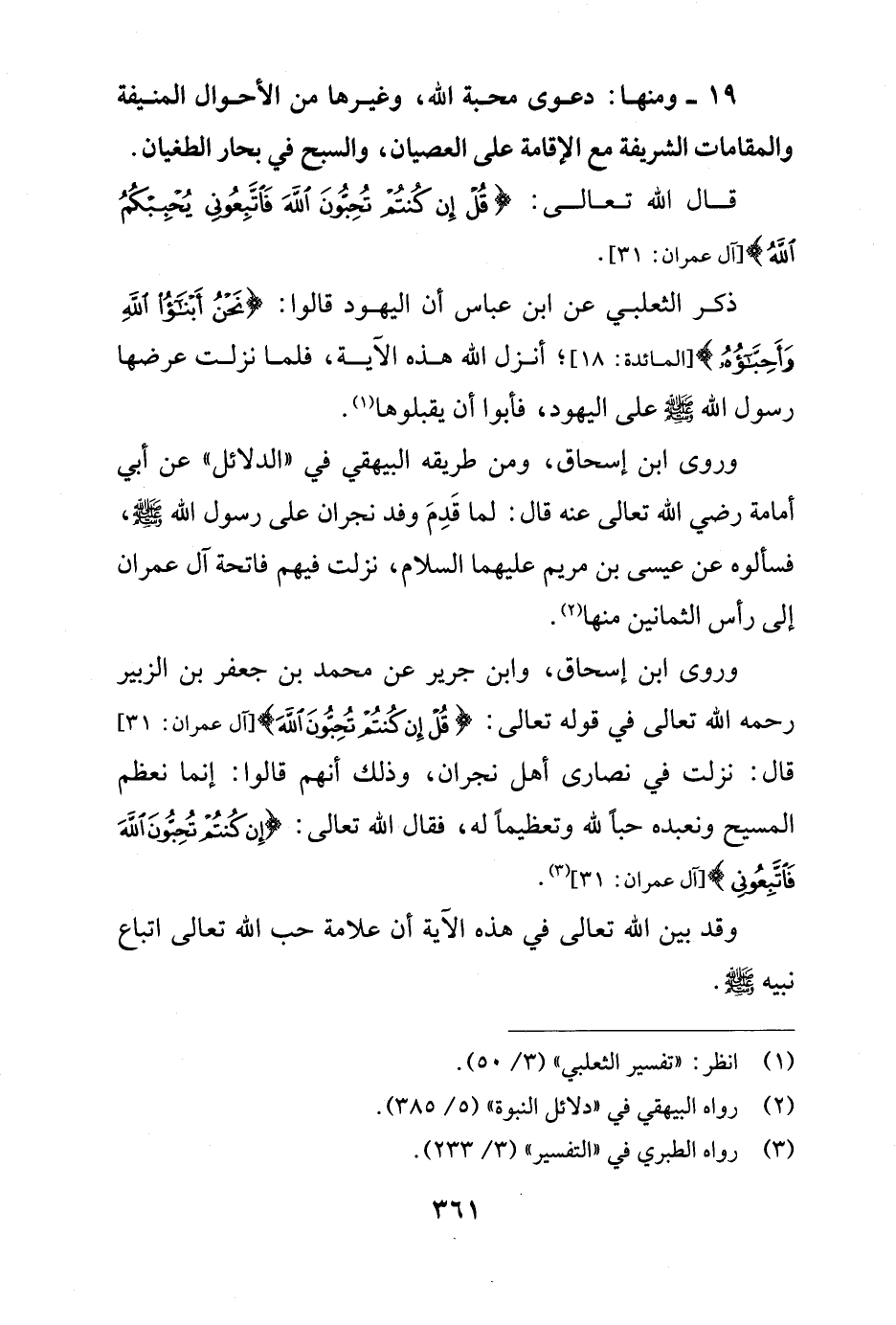 وروى ابن إسحاق، وابن جرير عن محمد بن جعفر بن الزبير رحمه الله تعالى في قوله تعالى: {قُلْ إِنْ كُنْتُمْ تُحِبُّونَ اللَّهَ} [آل عمران: 31] قال: نزلت في نصارى أهل نجران، وذلك أنهم قالوا: إنما نعظم المسيح ونعبده حباً لله وتعظيماً له، فقال الله تعالى: {إِنْ كُنْتُمْ تُحِبُّونَ اللَّهَ فَاتَّبِعُونِي} [آل عمران: 31] (¬3).