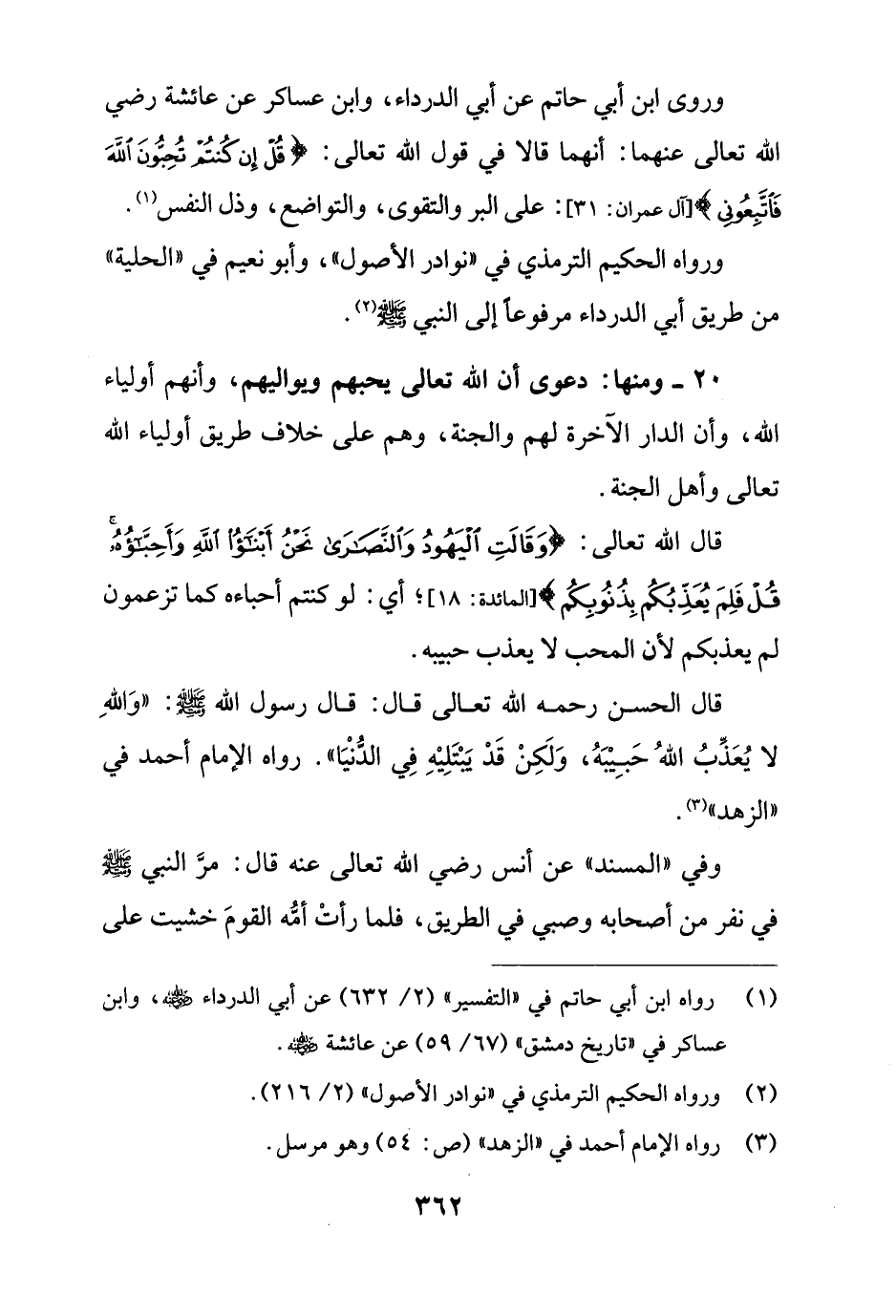 قال الله تعالى: {وَقَالَتِ الْيَهُودُ وَالنَّصَارَى نَحْنُ أَبْنَاءُ اللَّهِ وَأَحِبَّاؤُهُ قُلْ فَلِمَ يُعَذِّبُكُمْ بِذُنُوبِكُمْ} [المائدة: 18]؛ أي: لو كنتم أحباءه كما تزعمون لم يعذبكم لأن المحب لا يعذب حبيبه.