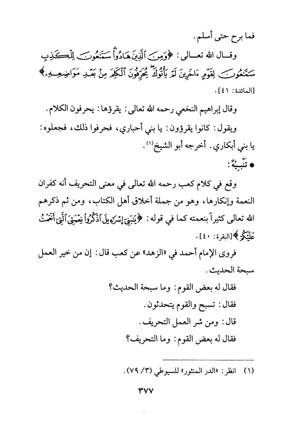 وقع في كلام كعب رحمه الله تعالى في معنى التحريف أنه كفران النعمة وإنكارها، وهو من جملة أخلاق أهل الكتاب، ومن ثم ذكرهم الله تعالى كثيرًا بنعمته كما في قوله: {يَابَنِي إِسْرَائِيلَ اذْكُرُوا نِعْمَتِيَ الَّتِي أَنْعَمْتُ عَلَيْكُمْ} [البقرة: 40].
