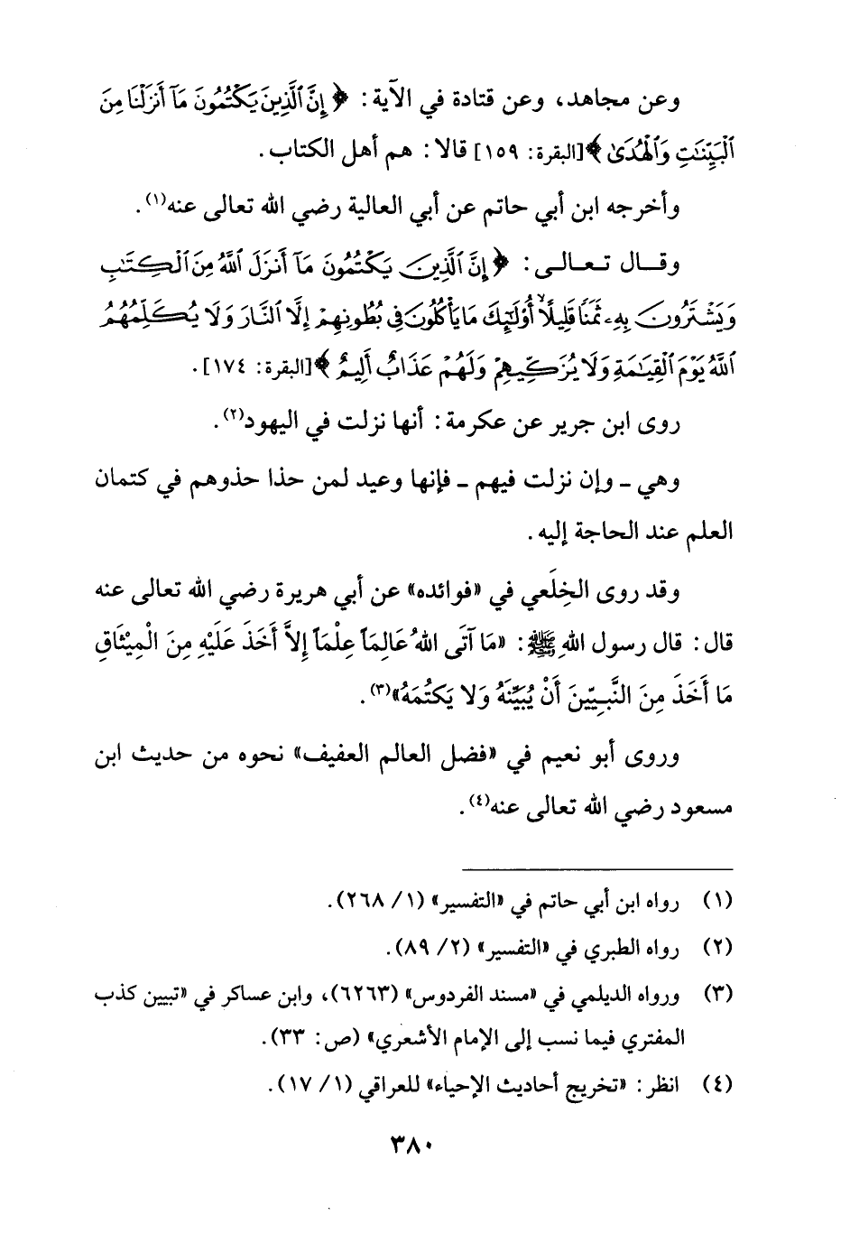 وقد روى الخِلَعي في "فوائده" عن أبي هريرة رضي الله تعالى عنه قال: قال رسول اللهِ - صلى الله عليه وسلم -: "مَا آتَى اللهُ عَالِمًا عِلْمًا إِلاَّ أَخَذَ عَلَيْهِ مِنَ الْمِيْثَاقِ مَا أَخَذَ مِنَ النَبِيِّينَ أَنْ يُبَيِّنَهُ وَلا يَكتُمَهُ" (¬3).