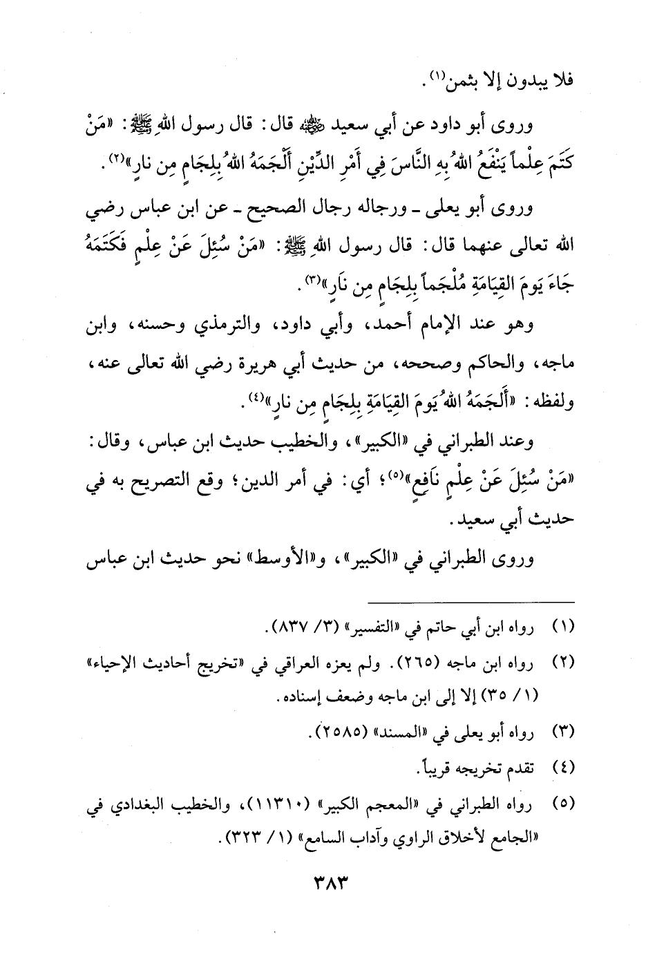 وروى أبو داود عن أبي سعيد - رضي الله عنه - قال: قال رسول اللهِ - صلى الله عليه وسلم -: "مَنْ كَتَمَ عِلْماً يَنْفَعُ اللهُ بِهِ النَّاسَ فِي أَمْرِ الدِّيْنِ أَلْجَمَهُ اللهُ بِلِجَامٍ مِن نارٍ" (¬2).