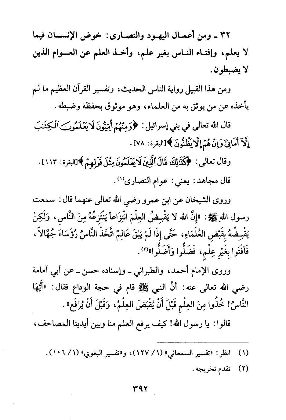 32 - ومن أعمال اليهود والنصارى: خوض الإنسان فيما لا يعلم، وإفتاء الناس بغير علم، وأخذ العلم عن العوام الذين لا يضبطون.