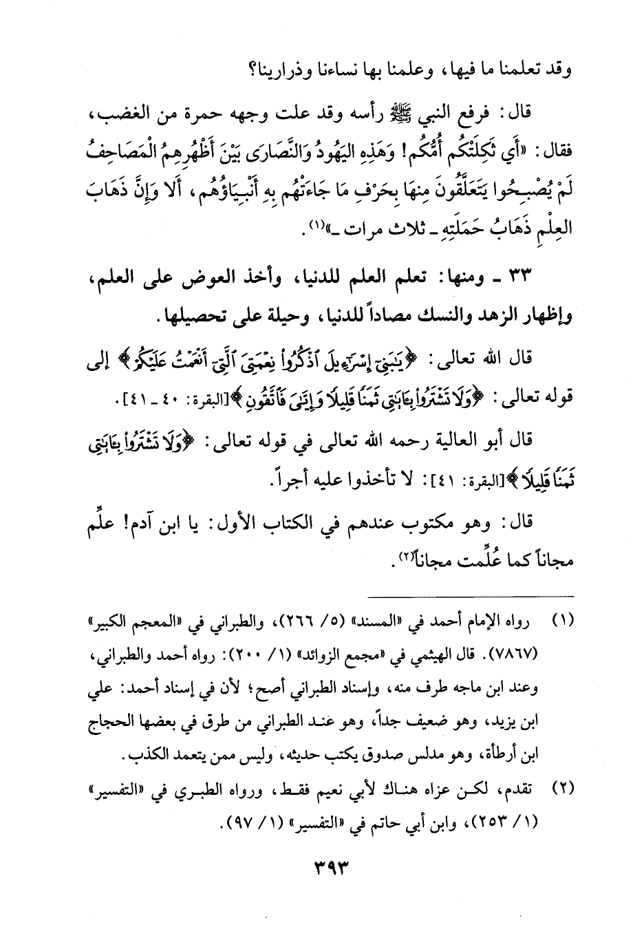 33 - ومنها: تعلم العلم للدنيا، وأخذ العوض على العلم، وإظهار الزهد والنسك مصاداً للدنيا، وحيلة على تحصيلها.