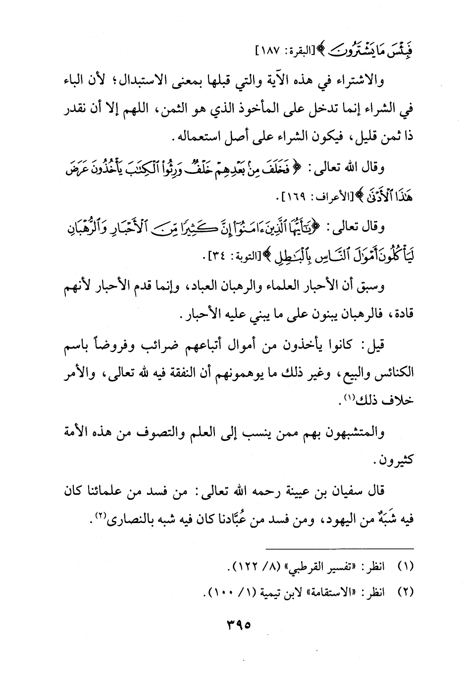 وقال تعالى: {يَا أَيُّهَا الَّذِينَ آمَنُوا إِنَّ كَثِيرًا مِنَ الْأَحْبَارِ وَالرُّهْبَانِ لَيَأْكُلُونَ أَمْوَالَ النَّاسِ بِالْبَاطِلِ} [التوبة: 34].