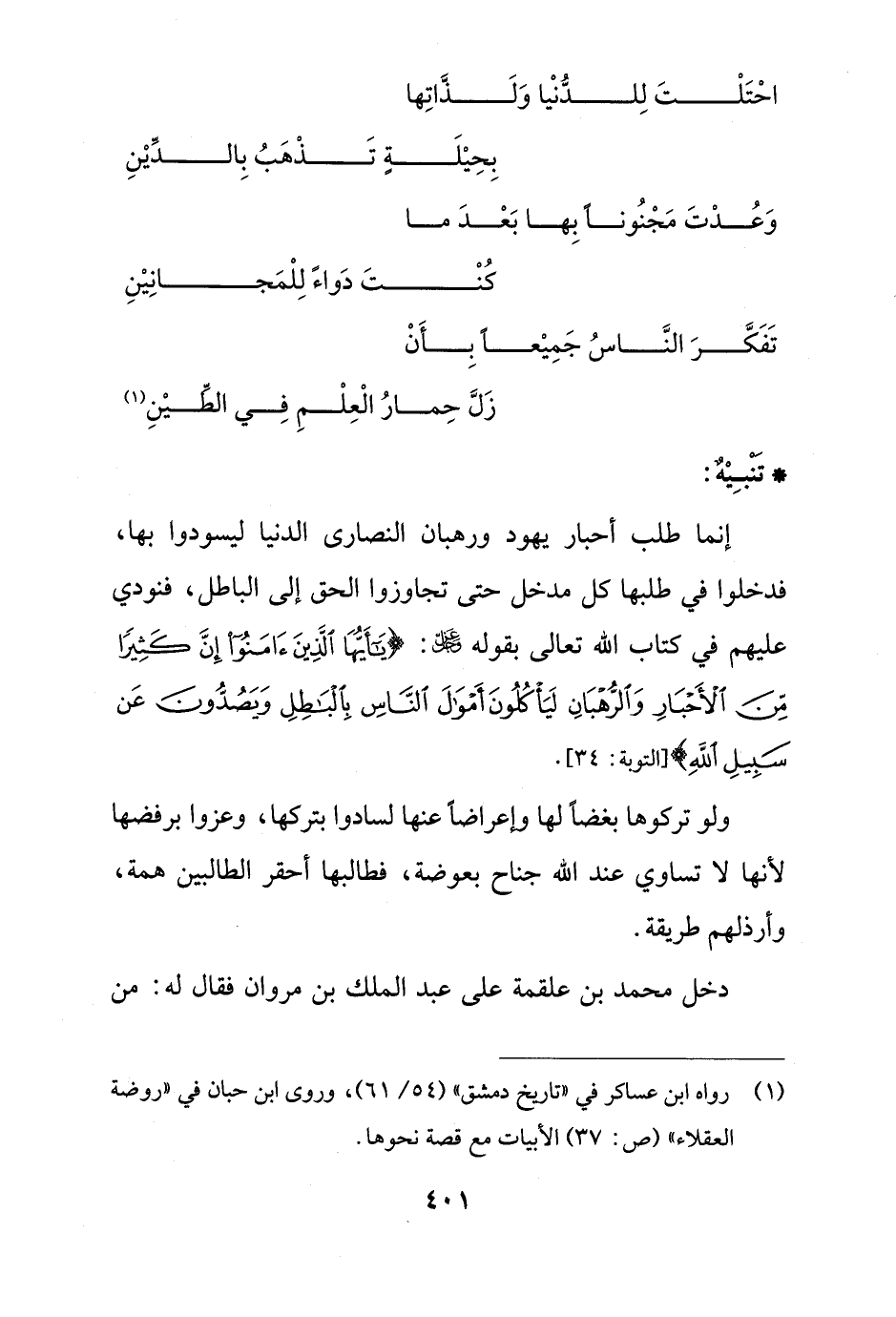 إنما طلب أحبار يهود ورهبان النصارى الدنيا ليسودوا بها، فدخلوا في طلبها كل مدخل حتى تجاوزوا الحق إلى الباطل، فنودي عليهم في كتاب الله تعالى بقوله عز وجل: {يَا أَيُّهَا الَّذِينَ آمَنُوا إِنَّ كَثِيرًا مِنَ الْأَحْبَارِ وَالرُّهْبَانِ لَيَأْكُلُونَ أَمْوَالَ النَّاسِ بِالْبَاطِلِ وَيَصُدُّونَ عَنْ سَبِيلِ اللَّهِ} [التوبة: 34].