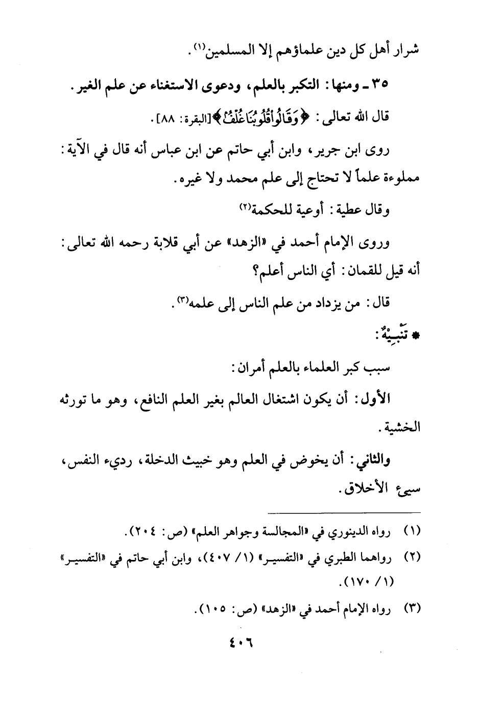 35 - ومنها: التكبر بالعلم، ودعوى الاستغناء عن علم الغير.