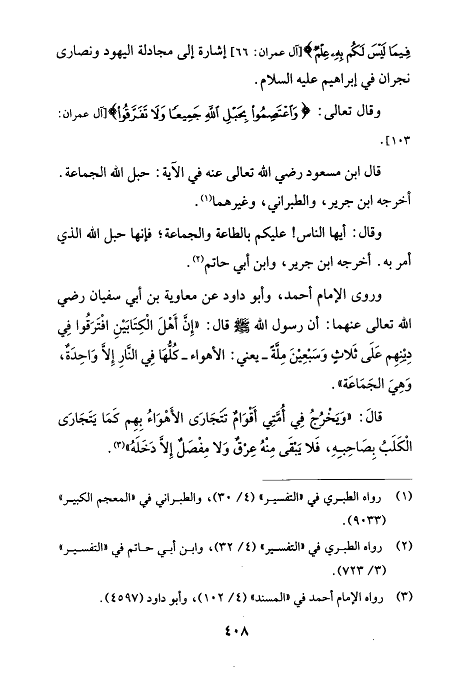 قال ابن مسعود رضي الله تعالى عنه في الآية: حبل الله الجماعة. أخرجه ابن جرير، والطبراني، وغيرهما (¬1).