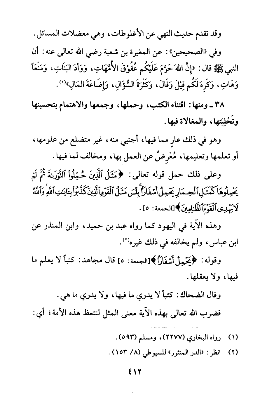38 - ومنها: اقتناء الكتب، وحملها، وجمعها والاهتمام بتحسينها وتَحْلِيَتِها، والمغالاة فيها.