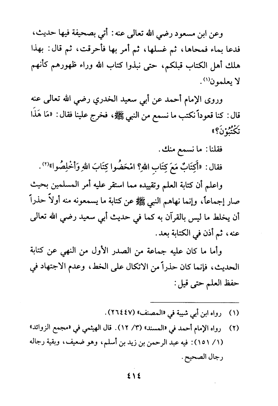 وعن ابن مسعود رضي الله تعالى عنه: أتي بصحيفة فيها حديث، فدعا بماء فمحاها، ثم غسلها، ثم أمر بها فأحرقت، ثم قال: بهذا هلك أهل الكتاب قبلكم، حتى نبذوا كتاب الله وراء ظهورهم كأنهم لا يعلمون (¬1).