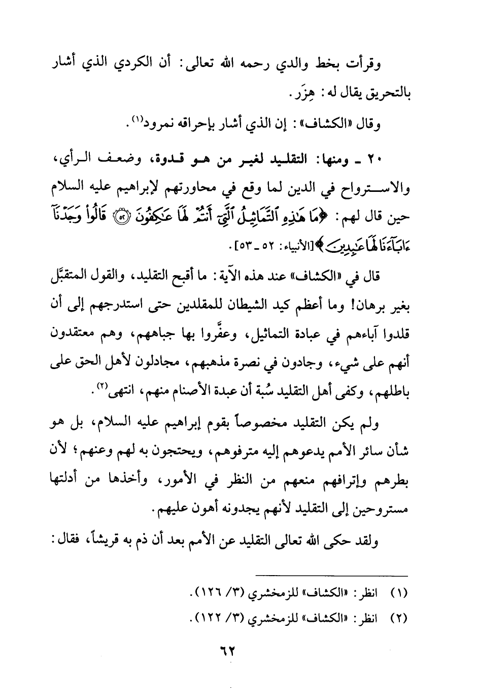 قال في "الكشاف" عند هذه الآية: ما أقبح التقليد، والقول المتقبَّل بغير برهان! وما أعظم كيد الشيطان للمقلدين حتى استدرجهم إلى أن قلدوا آباءهم في عبادة التماثيل، وعفَّروا بها جباههم، وهم معتقدون أنهم على شيء، وجادون في نصرة مذهبهم، مجادلون لأهل الحق على باطلهم، وكفى أهل التقليد سُبة أن عبدة الأصنام منهم، انتهى (¬2).