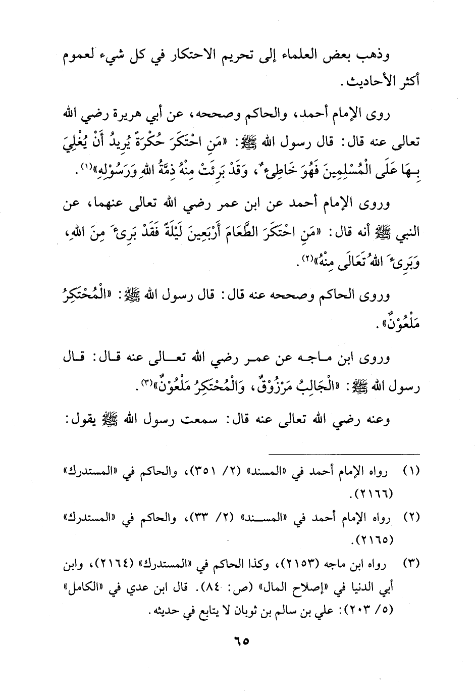 النبي - صلى الله عليه وسلم - أنه قال: "مَنِ احْتَكَرَ الطَّعَامَ أَرْبَعِينَ لَيْلَةً فَقَدْ بَرِئ مِنَ اللهِ، وَبَرِئ اللهُ تَعَالَى مِنْهُ" (¬2).