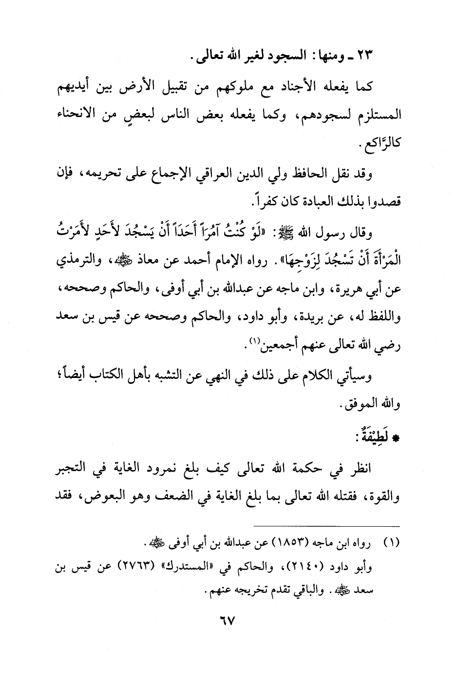 وقال رسول الله - صلى الله عليه وسلم -: "لَوْ كُنْتُ آمُرًا أَحَدًا أَنْ يَسْجُدَ لأَحَدٍ لأَمَرْتُ الْمَرْأةَ أَنْ تَسْجُدَ لِزَوْجِهَا". رواه الإمام أحمد عن معاذ - رضي الله عنه -، والترمذي عن أبي هريرة، وابن ماجه عن عبد الله بن أبي أوفى، والحاكم وصححه، واللفظ له، عن بريدة، وأبو داود، والحاكم وصححه عن قيس بن سعد رضي الله تعالى عنهم أجمعين (¬1).