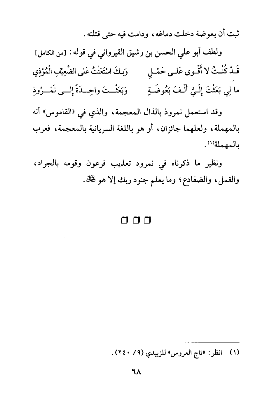 وقد استعمل نمروذ بالذال المعجمة، والذي في "القاموس" أنه بالمهملة، ولعلهما جائزان، أو هو باللغة السريانية بالمعجمة، فعرب بالمهملة (¬1).