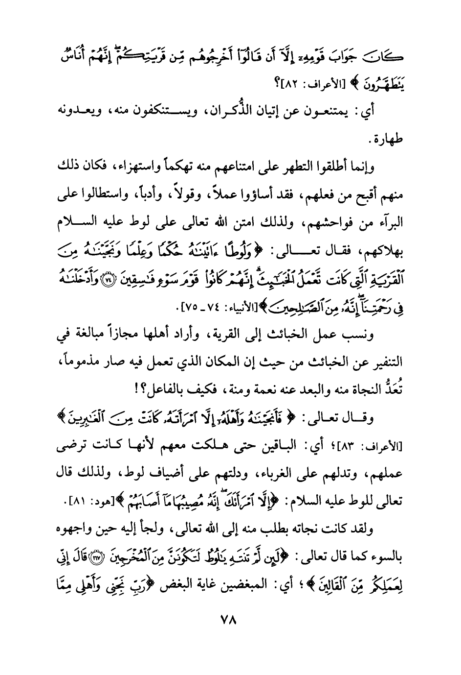 وإنما أطلقوا التطهر على امتناعهم منه تهكمًا واستهزاء، فكان ذلك منهم أقبح من فعلهم، فقد أساؤوا عملاً، وقولاً، وأدبًا، واستطالوا على البرآء من فواحشهم، ولذلك امتن الله تعالى على لوط عليه السلام بهلاكهم، فقال تعالى: {وَلُوطًا آتَيْنَاهُ حُكْمًا وَعِلْمًا وَنَجَّيْنَاهُ مِنَ الْقَرْيَةِ الَّتِي كَانَتْ تَعْمَلُ الْخَبَائِثَ إِنَّهُمْ كَانُوا قَوْمَ سَوْءٍ فَاسِقِينَ (74) وَأَدْخَلْنَاهُ فِي رَحْمَتِنَا إِنَّهُ مِنَ الصَّالِحِينَ (75)} [الأنبياء: 74، 75].