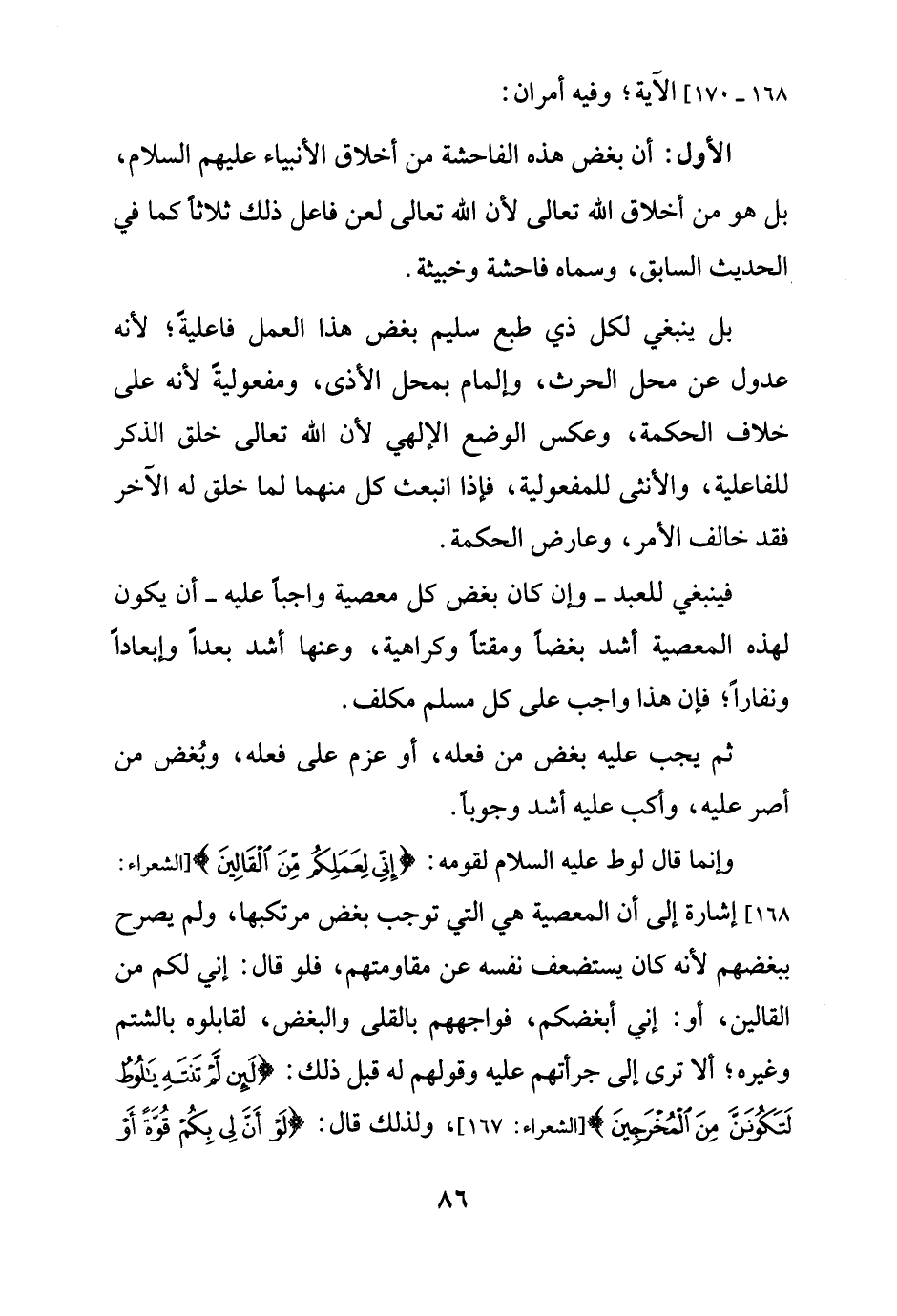 وإنما قال لوط عليه السلام لقومه: {قَالَ إِنِّي لِعَمَلِكُمْ مِنَ الْقَالِينَ (168)} [الشعراء: 168] إشارة إلى أن المعصية هي التي توجب بغض مرتكبها، ولم يصرح ببغضهم لأنه كان يستضعف نفسه عن مقاومتهم، فلو قال: إني لكم من القالين، أو: إني أبغضكم، فواجههم بالقلى والبغض، لقابلوه بالشتم وغيره؛ ألا ترى إلى جرأتهم عليه وقولهم له قبل ذلك: {لَئِنْ لَمْ تَنْتَهِ يَالُوطُ لَتَكُونَنَّ مِنَ الْمُخْرَجِينَ (167)} [الشعراء: 167]، ولذلك قال: {لَوْ أَنَّ لِي بِكُمْ قُوَّةً أَوْ