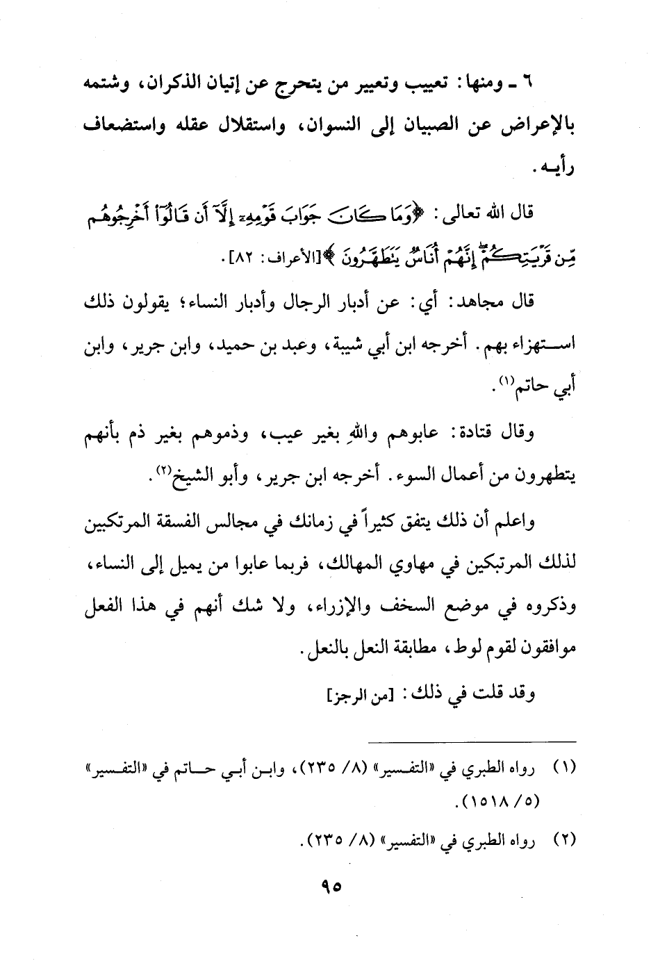 واعلم أن ذلك يتفق كثيرًا في زمانك في مجالس الفسقة المرتكبين لذلك المرتبكين في مهاوي المهالك، فربما عابوا من يميل إلى النساء، وذكروه في موضع السخف والإزراء، ولا شك أنهم في هذا الفعل موافقون لقوم لوط، مطابقة النعل بالنعل.