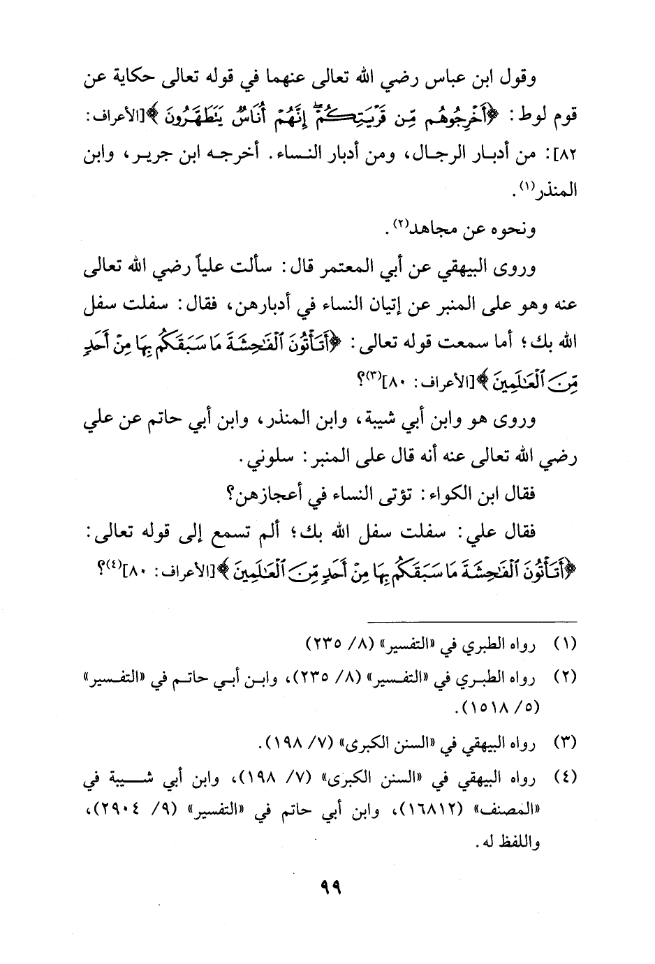 وقول ابن عباس رضي الله تعالى عنهما في قوله تعالى حكاية عن قوم لوط: {أَخْرِجُوهُمْ مِنْ قَرْيَتِكُمْ إِنَّهُمْ أُنَاسٌ يَتَطَهَّرُونَ (82)} [الأعراف: 82]: من أدبار الرجال، ومن أدبار النساء. أخرجه ابن جرير، وابن المنذر (¬1).