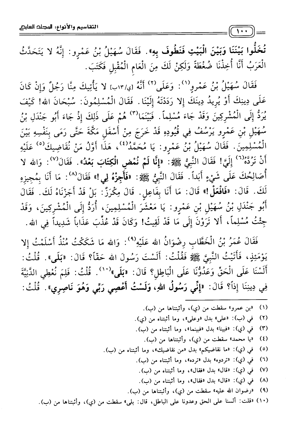 فَأَتَيْتُ النَّبِيَّ صَلى الله عَلَيه وسَلم فَقُلْتُ: أَلَسْتَ رَسُولَ اللهِ حَقًّا؟ قَالَ: "بَلَى"، قُلْتُ: أَلَسْنَا عَلَى الْحَقِّ وَعَدُوُّنَا عَلَى الْبَاطِلِ؟ قَالَ: "بَلَى"، قُلْتُ: فَلِمَ نُعْطِي الدَّنِيَّةَ فِي دِينِنَا إِذًا؟ قَالَ: "إِنِّي رَسُولُ اللهِ، وَلَسْتُ أَعْصِي رَبِّي، وَهُوَ نَاصِرِيّ"، قُلْتُ: أَوَلَيْسَ كُنْتَ تُحَدِّثُنَا أَنَّا سَنَأْتِي الْبَيْتَ فَنَطُوفُ بِهِ؟ قَالَ: "بَلَى، أَفَأَخْبَرْتُكَ أَنَّكَ تَأْتِيهِ الْعَامَ؟ " قَالَ: لَا، قَالَ: "فَإِنَّكَ تَأْتِيهِ فَتَطُوفُ بِهِ"، قَالَ: فَأَتَيْتُ أَبَا بَكْرٍ الصِّدِّيقَ رِضْوَانُ اللهِ عَلَيْهِ، فَقُلْتُ: يَا أَبَا بَكْرٍ، أَلَيْسَ هَذَا نَبِيَّ اللهِ حَقًّا؟ قَالَ: بَلَى، قُلْتُ: أَوَلَسْنَا عَلَى الْحَقِّ وَعَدُوُّنَا عَلَى الْبَاطِلِ؟ قَالَ: بَلَى، قُلْتُ: فَلِمَ نُعْطِي الدَّنِيَّةَ فِي دِينِنَا إِذًا؟ قَالَ: أَيُّهَا الرَّجُلُ، إِنَّهُ رَسُولُ اللهِ صَلى الله عَلَيه وسَلم وَلَيْسَ يَعْصِي رَبَّهُ، وَهُوَ نَاصِرُهُ، فَاسْتَمْسِكْ بِغَرْزِهِ حَتَّى تَمُوتَ، فَوَاللهِ إِنَّهُ عَلَى الْحَقِّ، قُلْتُ: أَوَلَيْسَ كَانَ يُحَدِّثُنَا أَنَّا سَنَأْتِي الْبَيْتَ وَنَطُوفُ بِهِ؟ قَالَ: بَلَى، قَالَ: فَأَخْبَرَكَ أَنَّكَ تَأْتِيهِ الْعَامَ؟ قُلْتُ: لَا، قَالَ: فَإِنَّكَ آتِيهِ وَتَطُوفُ بِهِ.