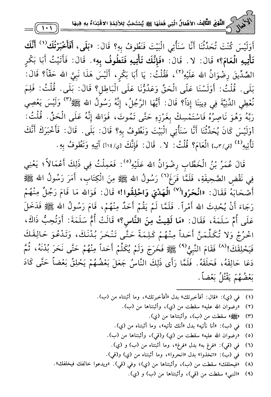 فَلَمَّا لَمْ يَقُمْ أَحَدٌ مِنْهُمْ، قَامَ رَسُولُ اللهِ صَلى الله عَلَيه وسَلم فَدَخَلَ عَلَى أُمِّ سَلَمَةَ، فَقَالَ: "مَا لَقِيتُ مِنَ النَّاسِ؟ " قَالَتْ أُمُّ سَلَمَةَ: أَوَتُحِبُّ ذَاكَ، اخْرُجْ وَلَا تُكَلِّمَنَّ أَحَدًا مِنْهُمْ كَلِمَةً حَتَّى تَنْحَرَ بُدْنَكَ، وَتَدْعُوَ حَالِقَكَ فَيَحْلِقَكَ! فَقَامَ النَّبِيُّ صَلى الله عَلَيه وسَلم فَخَرَجَ وَلَمْ يُكَلِّمْ أَحَدًا مِنْهُمْ حَتَّى نَحَرَ بُدْنَهُ، ثُمَّ دَعَا حَالِقَهُ، فَحَلَقَهُ، فَلَمَّا رَأَى ذَلِكَ النَّاسُ جَعَلَ بَعْضُهُمْ يَحْلِقُ بَعْضًا حَتَّى كَادَ بَعْضُهُمْ يَقْتُلُ بَعْضًا.