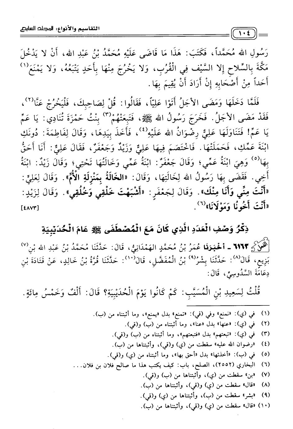 فَأَمَرَ، فَكَتَبَ مَكَانَ رَسُولِ اللهِ مُحَمَّدًا، فَكَتَبَ: هَذَا مَا قَاضَى عَلَيْهِ مُحَمَّدُ بْنُ عَبْدِ اللهِ، أَنْ لَا يَدْخُلَ مَكَّةَ بِالسِّلَاحِ إِلَاّ السَّيْفَ فِي الْقُرُبِ، وَلَا يَخْرُجَ مِنْهَا بِأَحَدٍ يَتْبَعُهُ، وَلَا يَمْنَعَ أَحَدًا مِنْ أَصْحَابِهِ إِنْ أَرَادَ أَنْ يُقِيمَ بِهَا. فَلَمَّا دَخَلَهَا وَمَضَى الأَجَلُ أَتَوْا عَلِيًّا، فَقَالُوا: قُلْ لِصَاحِبِكَ: فَلْيَخْرُجْ عَنَّا، فَقَدْ مَضَى الأَجَلُ، فَخَرَجَ رَسُولُ اللهِ صَلى الله عَلَيه وسَلم، فَتَبِعَتْهُمْ بِنْتُ حَمْزَةَ تُنَادِي: يَا عَمُّ يَا عَمُّ، فَتَنَاوَلَهَا عَلِيٌّ رِضْوَانَ اللهِ عَلَيْهِ، فَأَخَذَ بِيَدِهَا، وَقَالَ لِفَاطِمَةَ: دُونَكِ ابْنَةَ عَمِّكِ، فَحَمَلَتْهَا، فَاخْتَصَمَ فِيهَا عَلِيٌّ وَزَيْدٌ وَجَعْفَرٌ، فَقَالَ عَلِيٌّ: أَنَا أَحَقُّ بِهَا وَهِيَ ابْنَةُ عَمِّي، وَقَالَ جَعْفَرٌ: ابْنَةُ عَمِّي وَخَالَتُهَا تَحْتِي، وَقَالَ زَيْدٌ: ابْنَةُ أَخِي، فَقَضَى بِهَا رَسُولُ اللهِ لِخَالَتِهَا، وَقَالَ: "الْخَالَةُ بِمَنْزِلَةِ الأُمِّ"، وَقَالَ لِعَلِيٍّ: "أَنْتَ مِنِّي وَأَنَا مِنْكَ"، وَقَالَ لِجَعْفَرٍ: "أَشْبَهْتَ خَلْقِي وَخُلُقِي"، وَقَالَ لِزَيْدٍ: "أَنْتَ أَخُونَا وَمَوْلَانَا". [٤٨٧٣]