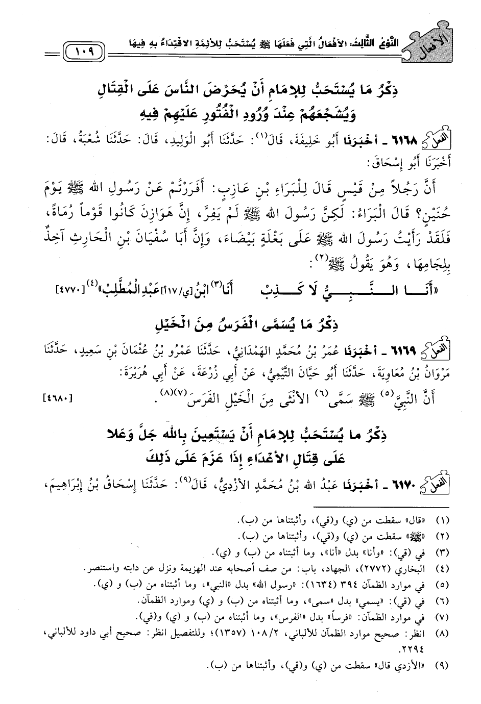 ٦١٦٨ - أَخبَرنا أَبُو خَلِيفَةَ، قَالَ: حَدثنا أَبُو الْوَلِيدِ، قَالَ: حَدثنا شُعْبَةُ، قَالَ: أَخبَرنا أَبُو إِسْحَاقَ، أَنَّ رَجُلاً مِنْ قَيْسٍ قَالَ لِلْبَرَاءِ بْنِ عَازِبٍ: أَفَرَرْتُمْ عَنْ رَسُولِ اللهِ صَلى الله عَلَيه وسَلم يَوْمَ حُنَيْنٍ؟ قَالَ الْبَرَاءُ: لَكِنَّ رَسُولَ اللهِ صَلى الله عَلَيه وسَلم لَمْ يَفِرَّ، إِنَّ هَوَازِنَ كَانُوا قَوْمًا رُمَاةً، فَلَقَدْ رَأَيْتُ رَسُولَ اللهِ صَلى الله عَلَيه وسَلم عَلَى بَغْلَةٍ بَيْضَاءَ، وَإِنَّ أَبَا سُفْيَانَ بْنَ الْحَارِثِ آخِذٌ بِلِجَامِهَا، وَهُوَ يَقُولُ صَلى الله عَلَيه وسَلم: