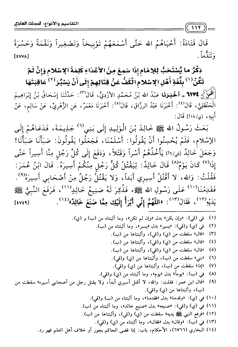٦١٧٤ - أَخبَرنا عَبْدُ اللهِ بْنُ مُحَمَّدٍ الأَزْدِيُّ، قَالَ: حَدثنا إِسْحَاقُ بْنُ إِبْرَاهِيمَ الْحَنْظَلِيُّ، قَالَ: أَخبَرنا عَبْدُ الرَّزَّاقِ، قَالَ: أَخبَرنا مَعْمَرٌ، عَنِ الزُّهْرِيِّ، عَنْ سَالِمٍ، عَنْ أَبِيهِ، قَالَ: بَعَثَ رَسُولُ اللهِ صَلى الله عَلَيه وسَلم خَالِدَ بْنَ الْوَلِيدِ إِلَى بَنِي جَذِيمَةَ، فَدَعَاهُمْ إِلَى الإِسْلَامِ، فَلَمْ يُحْسِنُوا أَنْ يَقُولُوا: أَسْلَمْنَا، فَجَعَلُوا يَقُولُونَ: صَبَأْنَا صَبَأْنَا! وَجَعَلَ خَالِدٌ يَأْخُذُهُمْ أَسْرًا وَقَتْلاً، وَدَفَعَ إِلَى كُلِّ رَجُلٍ مِنَّا أَسِيرًا حَتَّى إذا كَانَ يَوْمٌ، قَالَ خَالِدٌ: لِيَقْتُلْ كُلُّ رَجُلٍ مِنْكُمْ أَسِيرَهُ، قال ابن عمر: فقلت: والله لا أقتل أسيري أبدا، ولا يقتل رجل من أصحابي أَسِيرَهُ. فَقَدِمْنَا عَلَى رَسُولِ اللهِ صَلى الله عَلَيه وسَلم، فَذُكِرَ لَهُ صَنِيعُ خَالِدٍ، فَرَفَعَ النَّبِيُّ صَلى الله عَلَيه وسَلم يَدَيْهِ، فَقَالَ: "اللهُمَّ إِنِّي أَبْرَأُ إِلَيْكَ مِمَّا صَنَعَ خَالِدٌ". [٤٧٤٩]